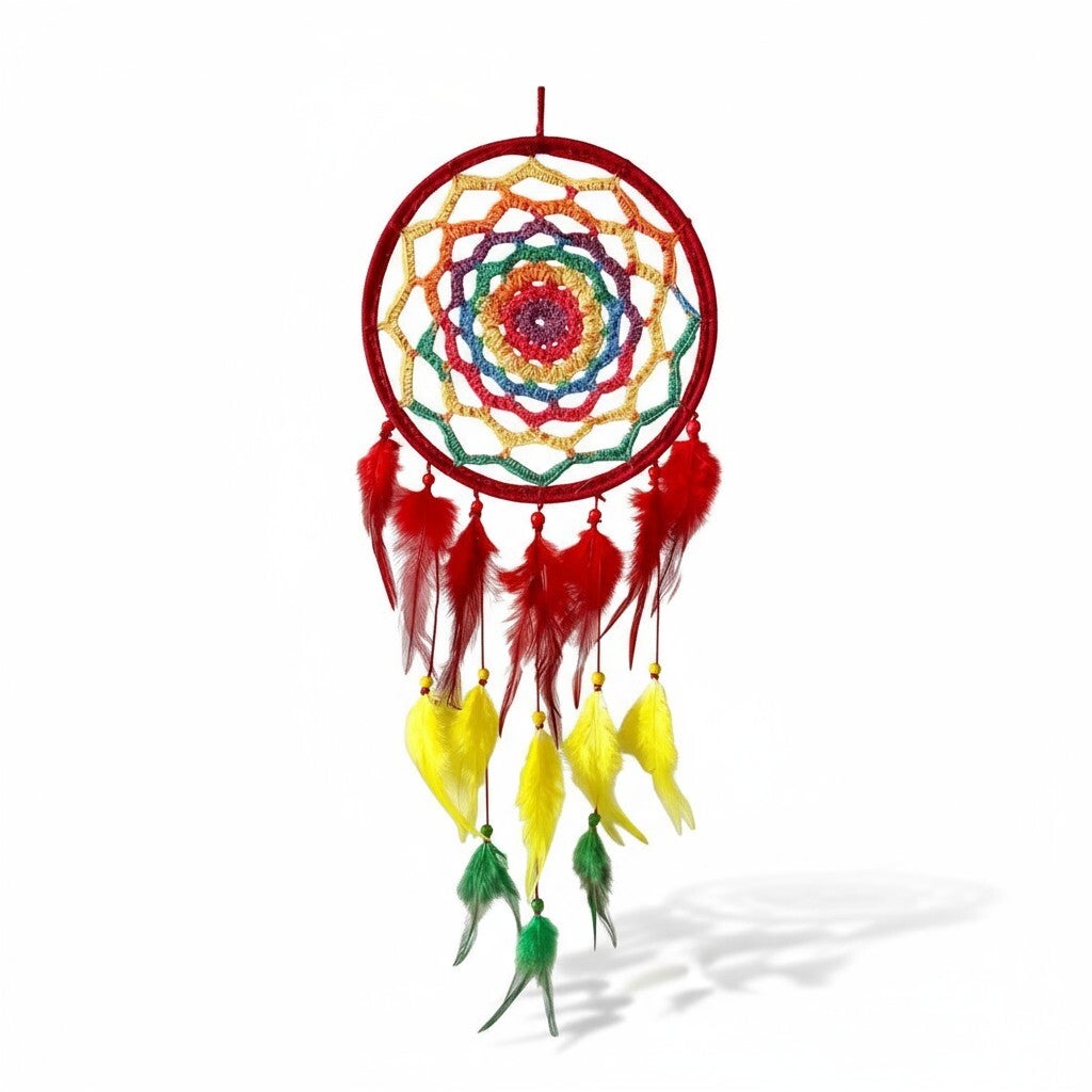 Farverig hæklet drømmefanger i 100 bomuld med indfarvede fjer.