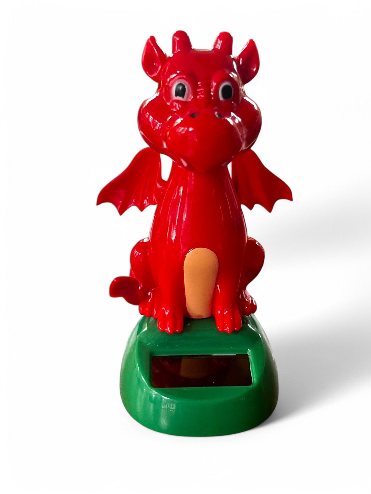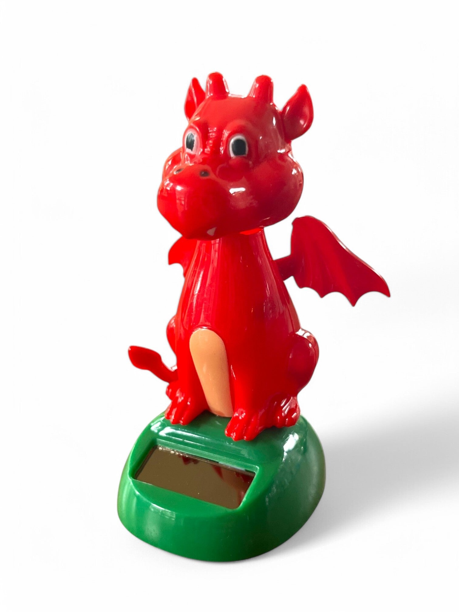 Sjov og sød rød drage der rokker med hoved og vinger når solen skinner.