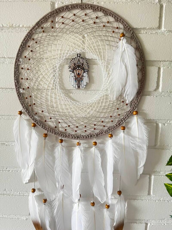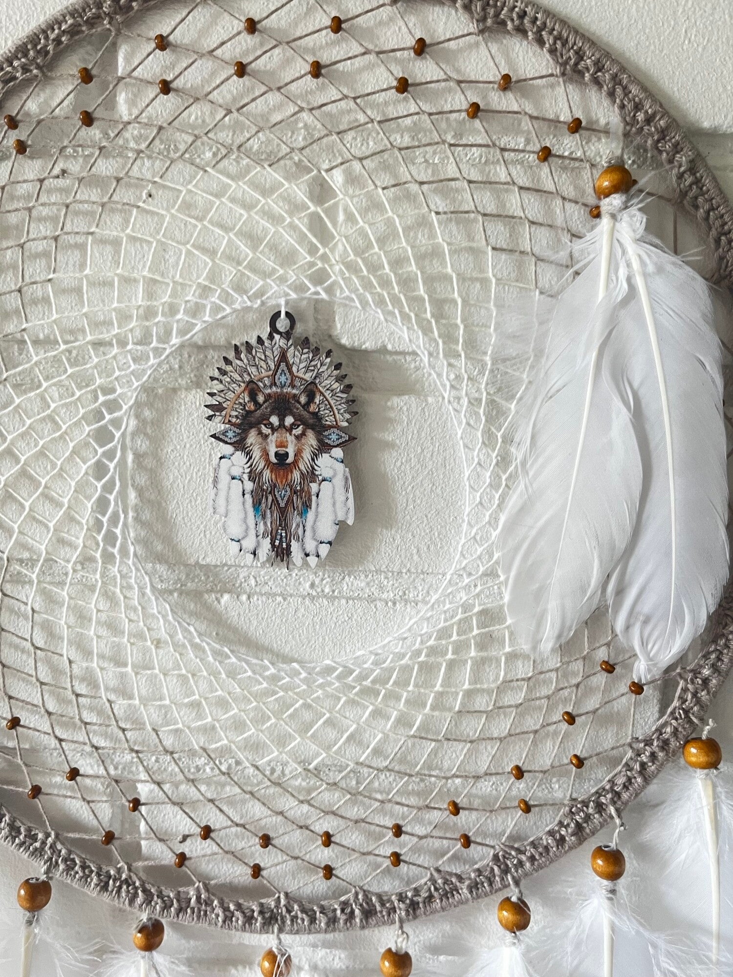 Stor drømmefanger i beige og hvis med vedhæng med ulv i midten