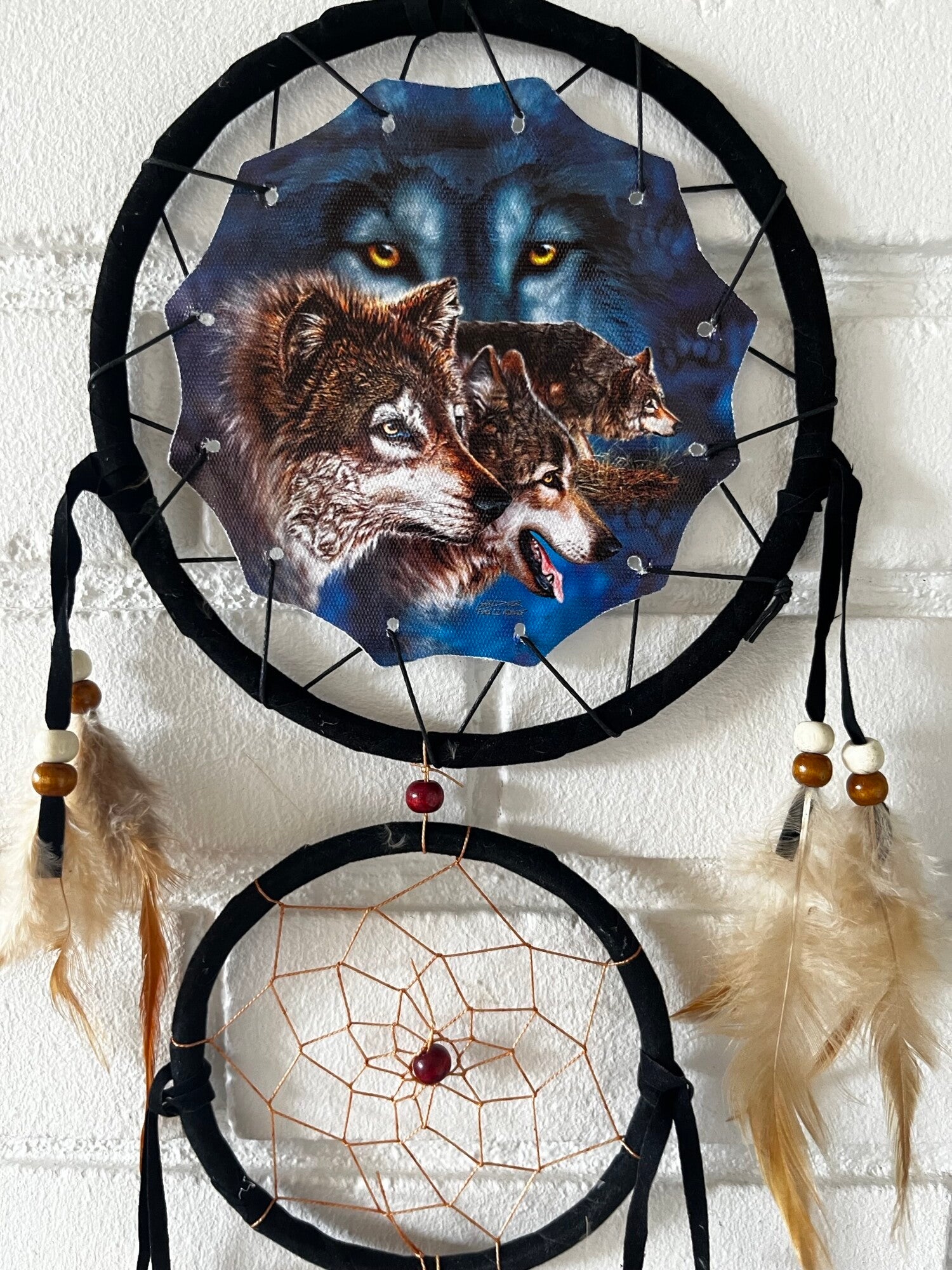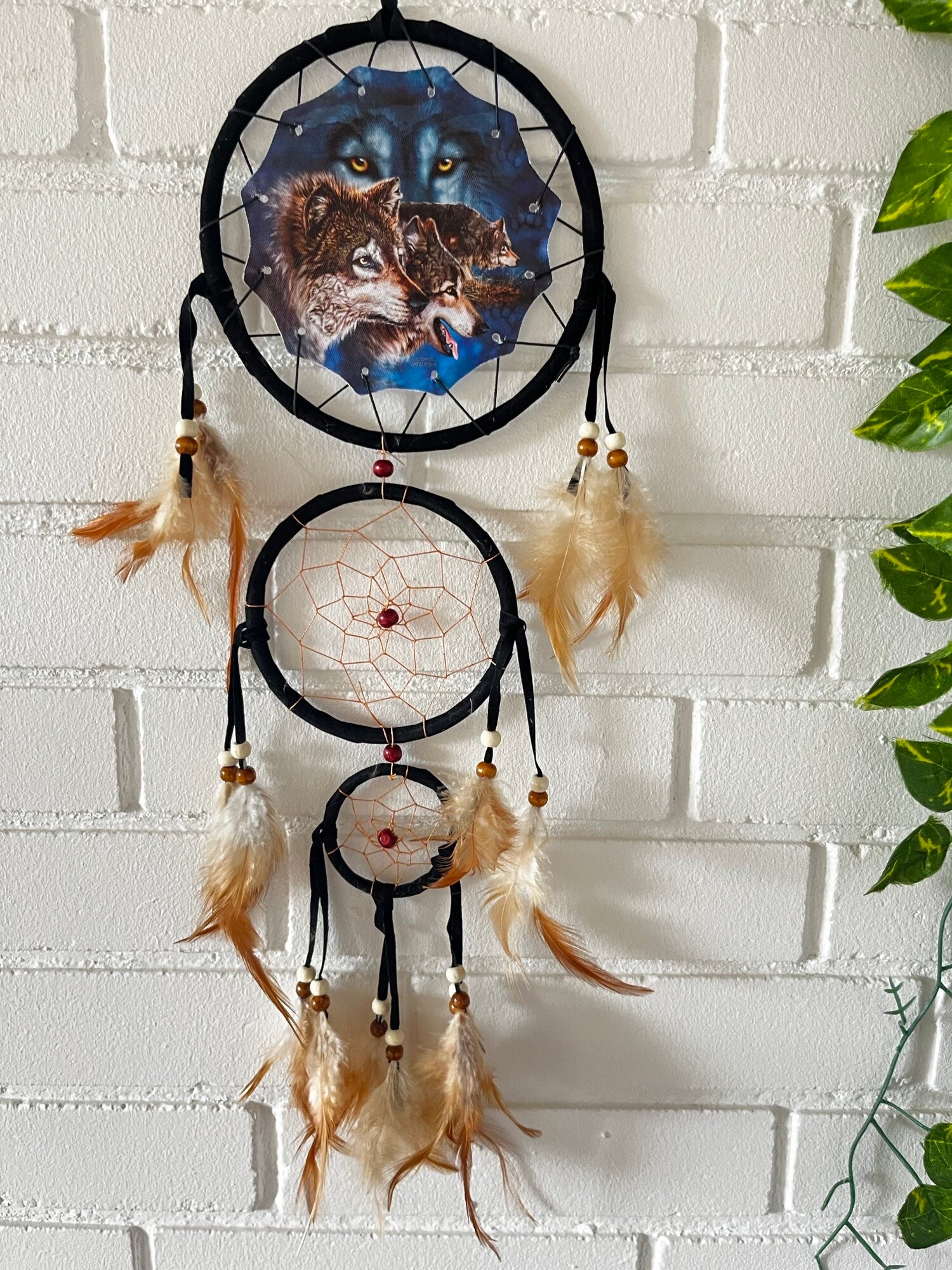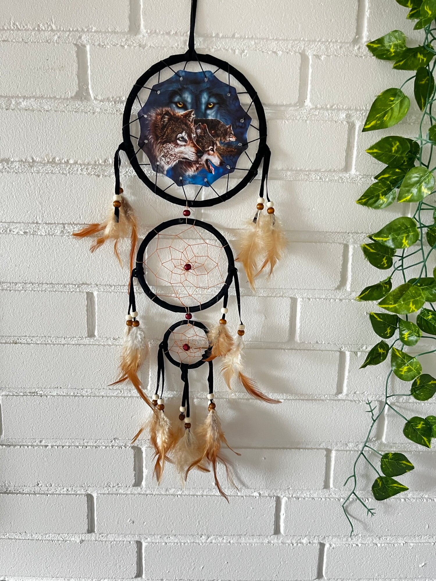 Mandala drømmefanger med 3 ringe med motiv af ulve