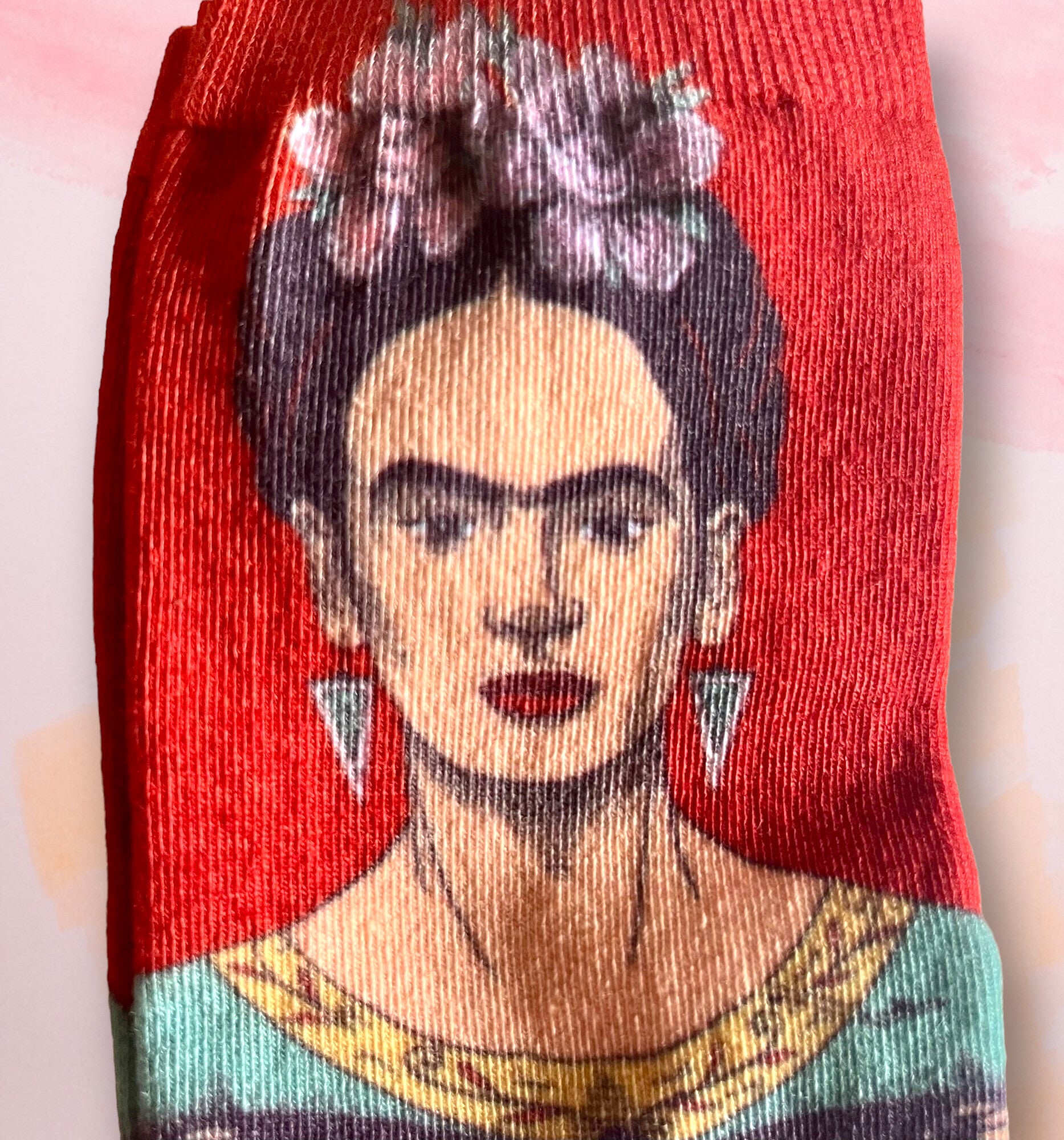 Tilføj et kunstnerisk touch til dit look med disse flotte røde strømper, prydet med et inspirerende Frida Kahlo motiv. Komfortable og stilfulde, perfekte til både hverdag og specielle lejligheder.