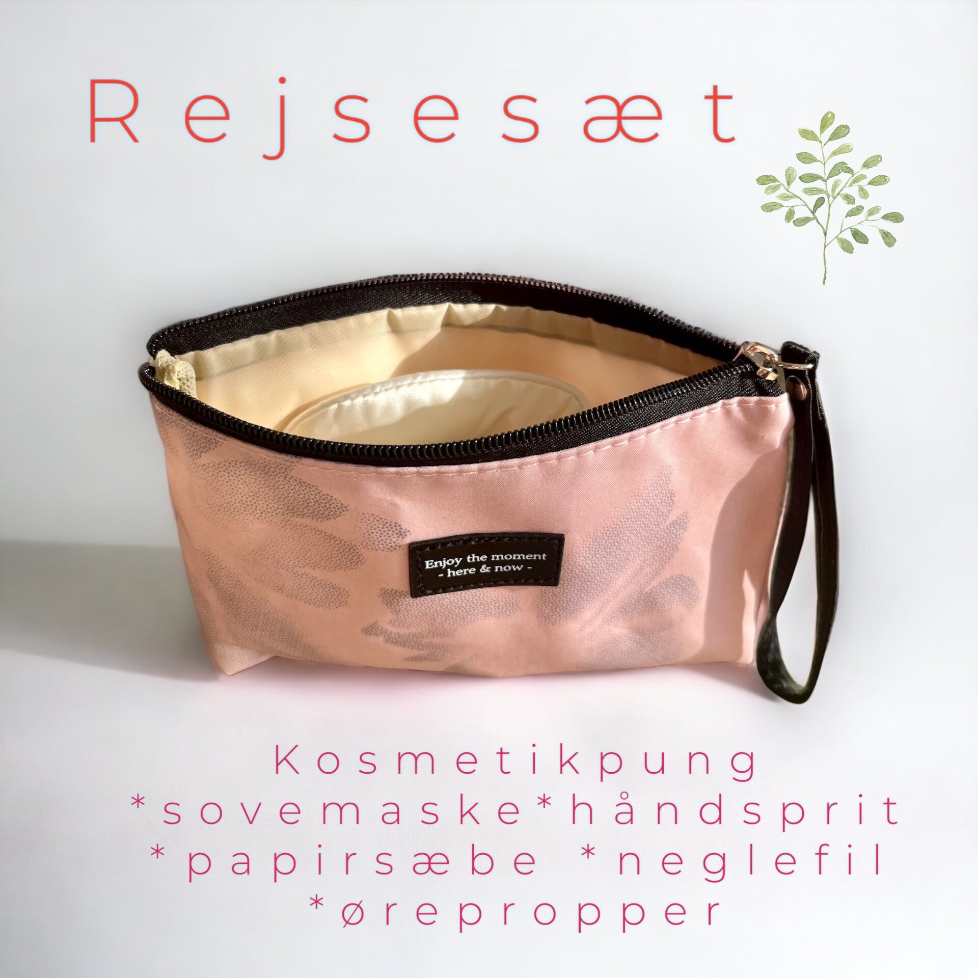 En lille rejsetaske sparer dig for rod og gør det nemt at holde styr på det mest nødvendige: en blød sovemaske til at lukke verden ude, håndsprit og papirsæbe til hurtig hygiejne, ørepropper mod støj, og lidt ekstra som neglefil og hårelastikker for følelsen af at være frisk – selv midt i transit.