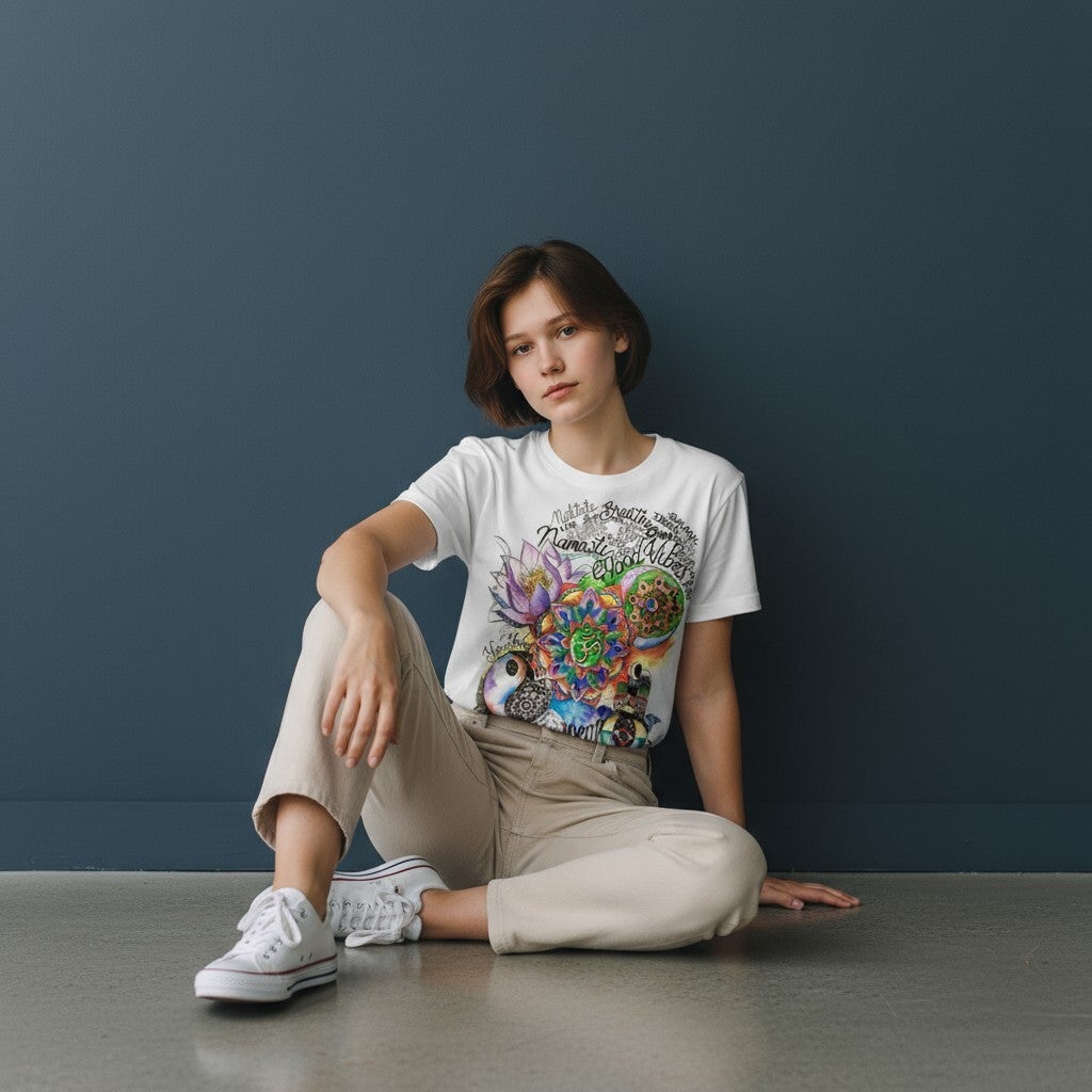 Denne T-shirt er den perfekte kombination af boho-stil og funktionalitet. Den har et smukt print og inspirerende tekst, der giver dig den rette vibe – ideel til yoga, afslapning eller en afslappet dag på farten. Materialet i polyester og bomuld gør den både nem at vaske og fri for krøl – så du altid er klar til at stråle.