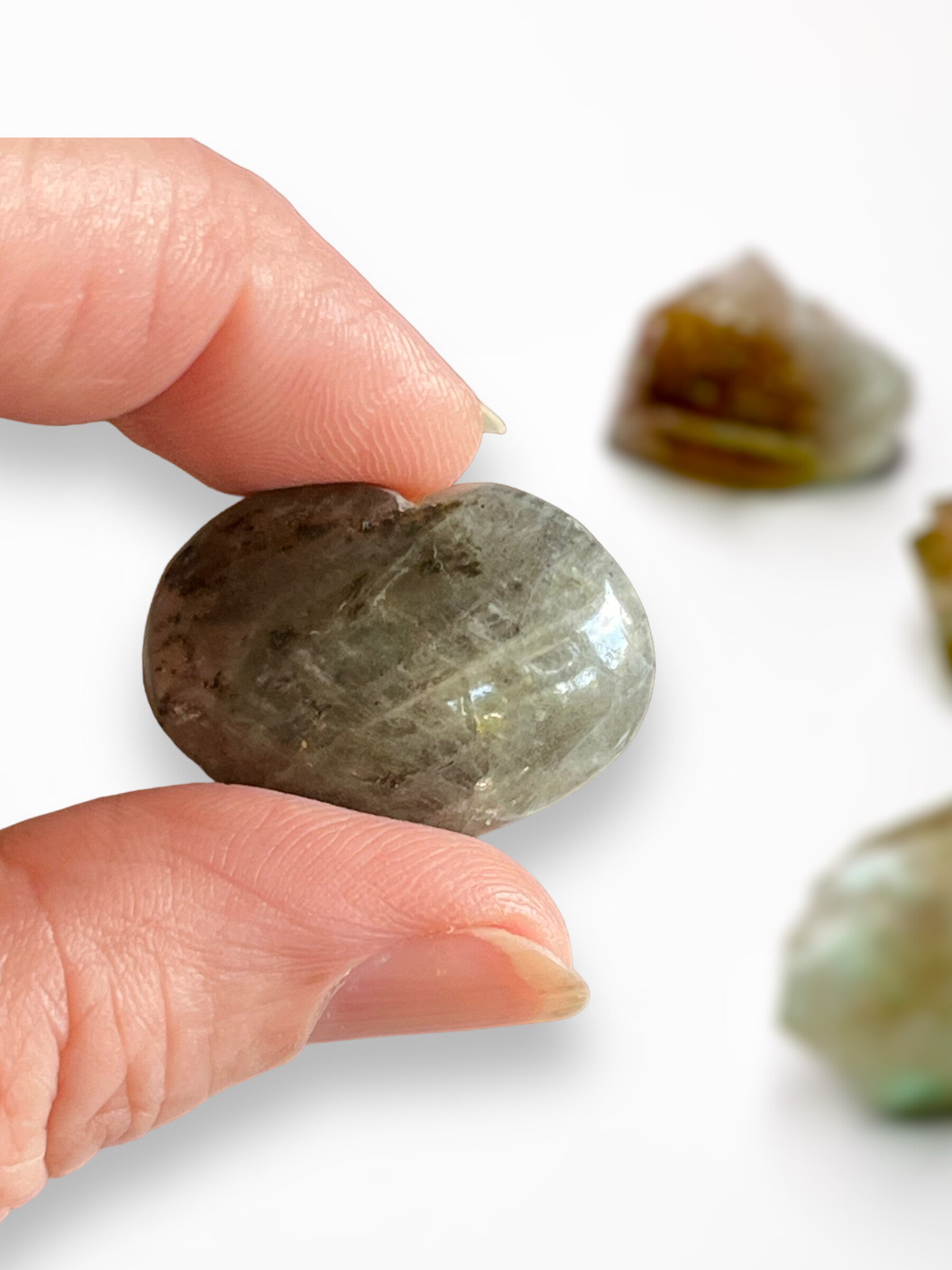 Labradolit: er en sten, der beskytter mod stress og angst. Det er en magisk sten, der hjælper med at afbalancere din aura og give klarsyn. Ønsker man psykisk eller personlig udvikling, er labradorit et godt valg