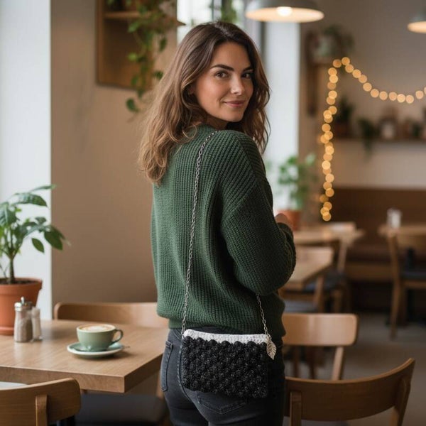 Hver taske er hæklet i hånden og designet med kreativitet og kærlighed. Det er små unika, hvor ingen er helt ens – og netop det gør dem særlige.