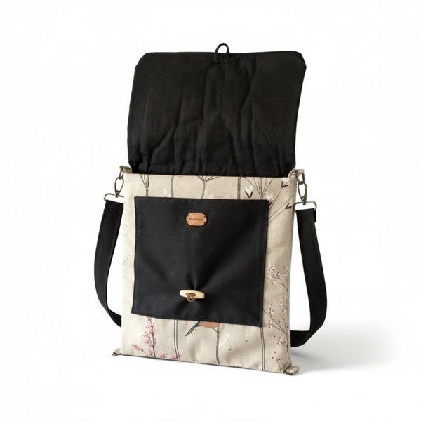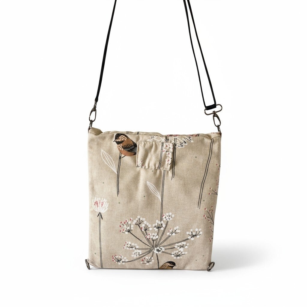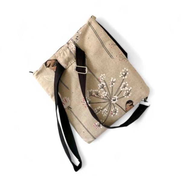 Flot vatteret stof taske med fugle/blomster motiv udvendig og sort fór indvendig.