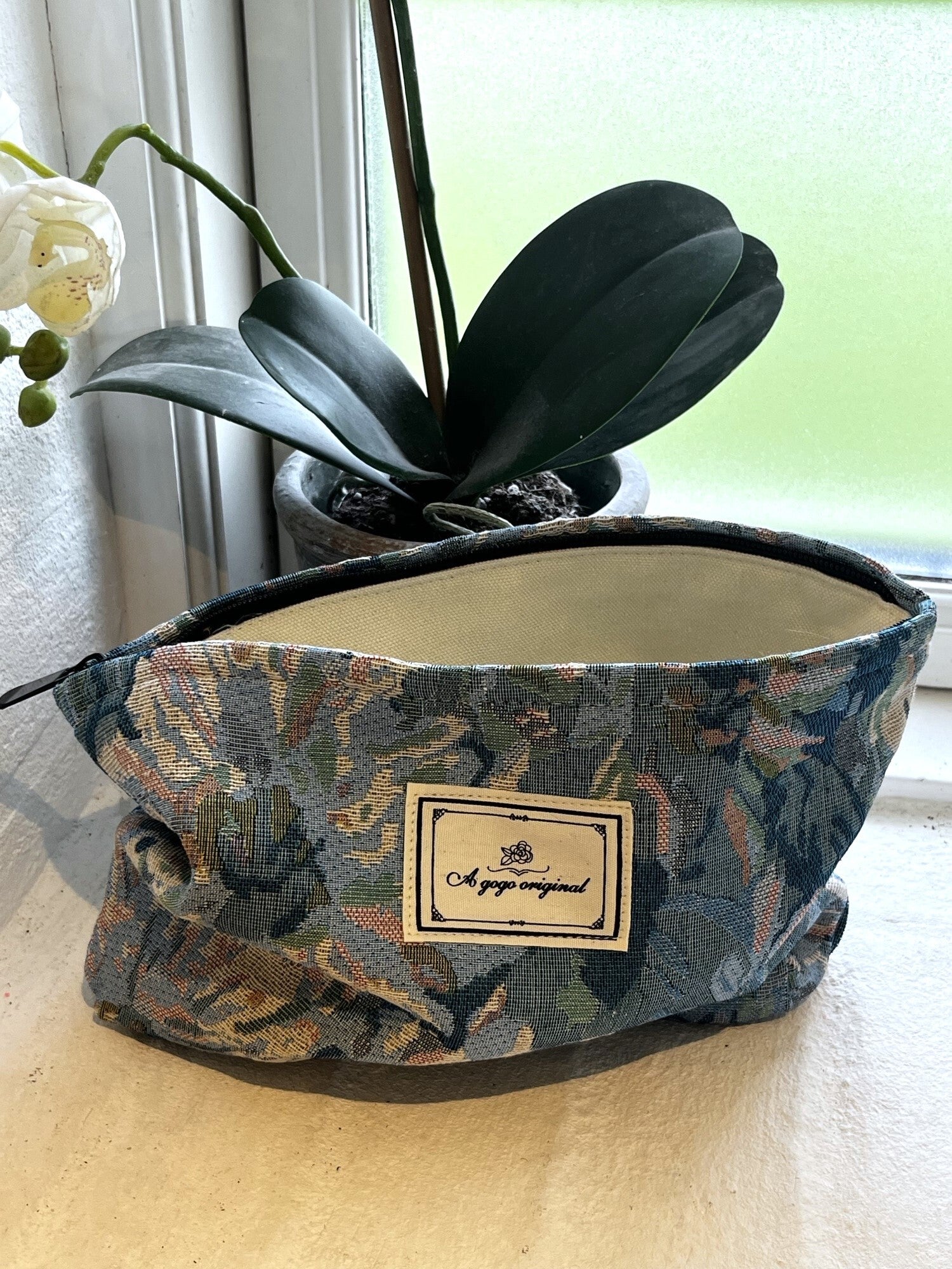 Unik toilettaske med et smukt lyseblåt blomstermønster, der skaber et romantisk og elegant udtryk.