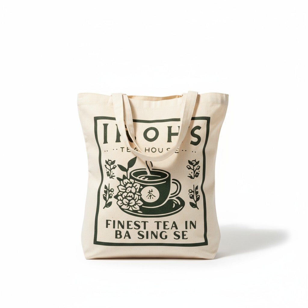 Kraftig net i råhvid støvet grønt motiv og text " Iroh´s tea"