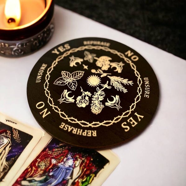 Ouija Boardet er fremstillet af træ og er udsmykket med smukke detaljer, der tilføjer en unik æstetik til din spirituelle praksis.