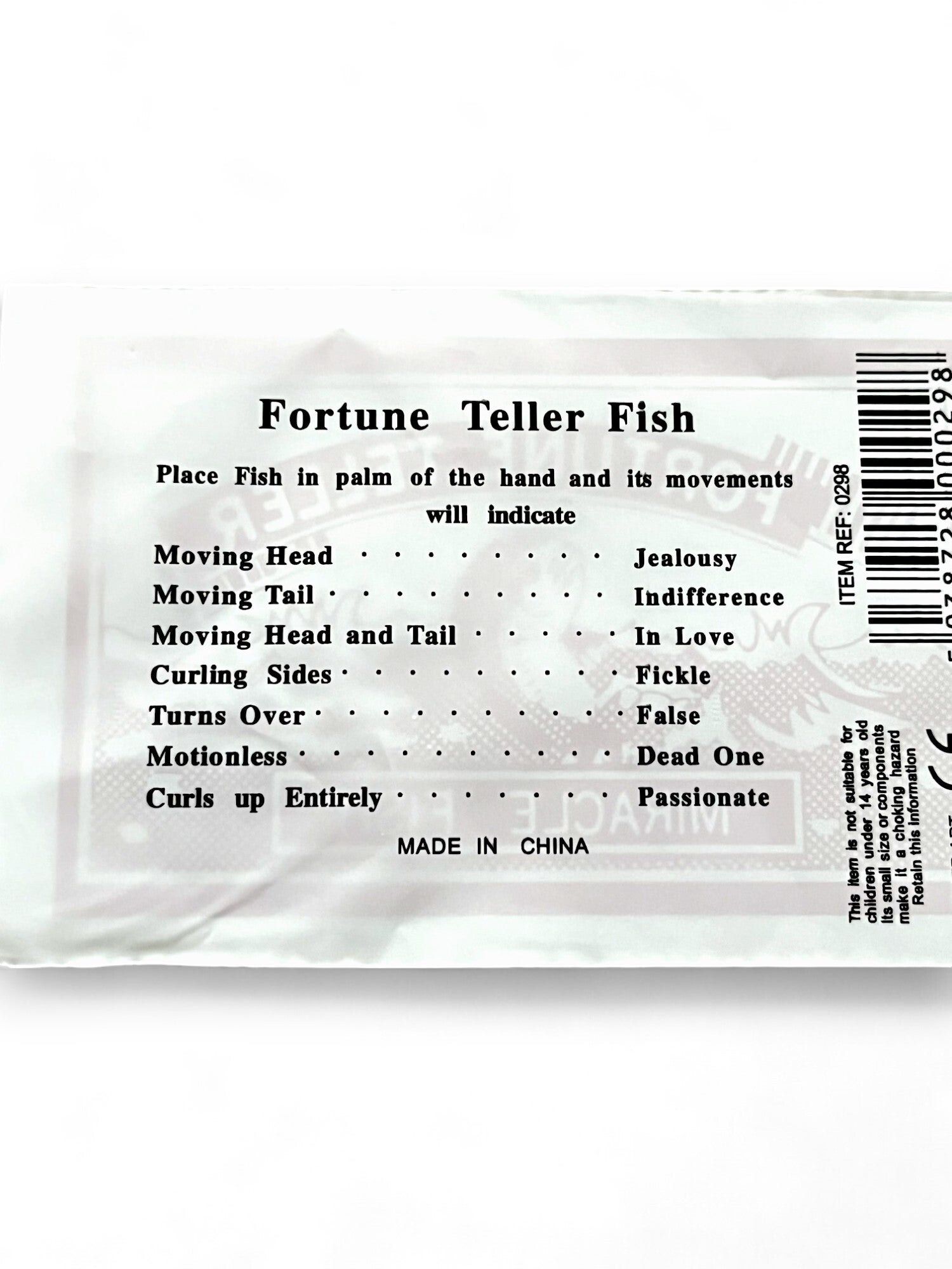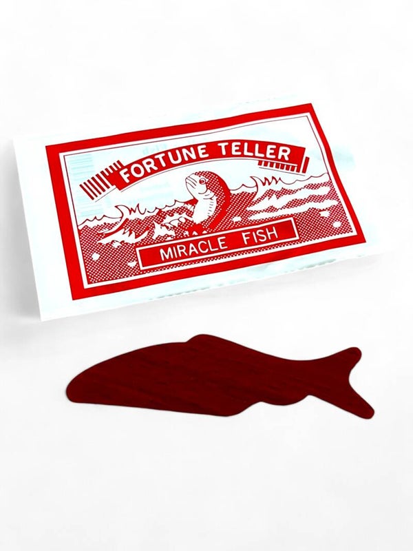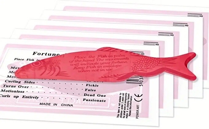 Placer den lille røde plast fisk i hånden og se hvordan den bugter og snor sig - se derefter hvad det betyder bag på pakken.