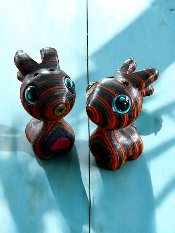 Nuttet håndlavet træ hjort med blå øjne og farverig stribet krop.