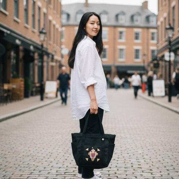 Sort skuldertaske i kraftig kanvas med iøjnefaldende Sacred Heart-patch med simili-sten og gyldne bi-patches for et unikt, mystisk udtryk. Pyntet med en smuk sol/måne-pin – en rå og spirituel taske med masser af personlighed.