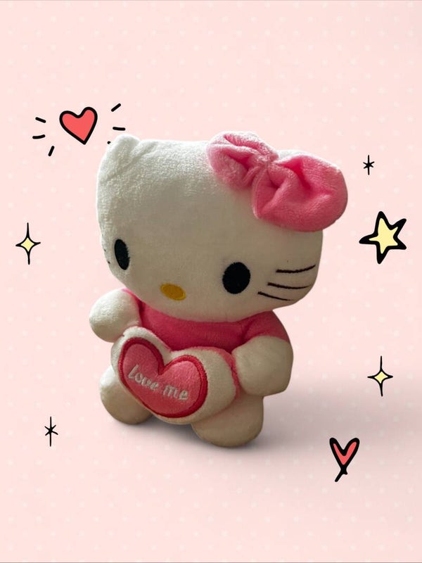 Sød lille Hello Kitty bamse med hjerte hvor der står "love me"