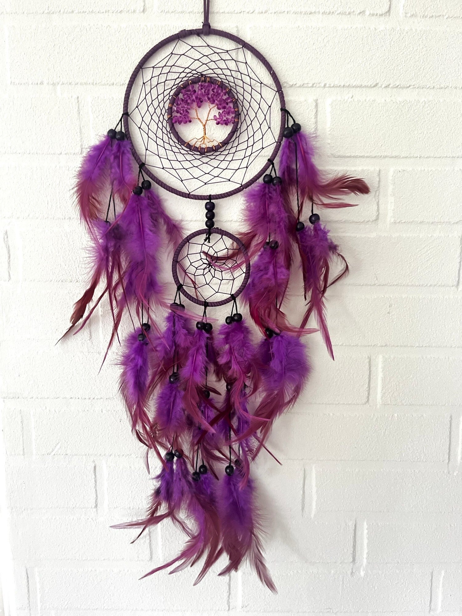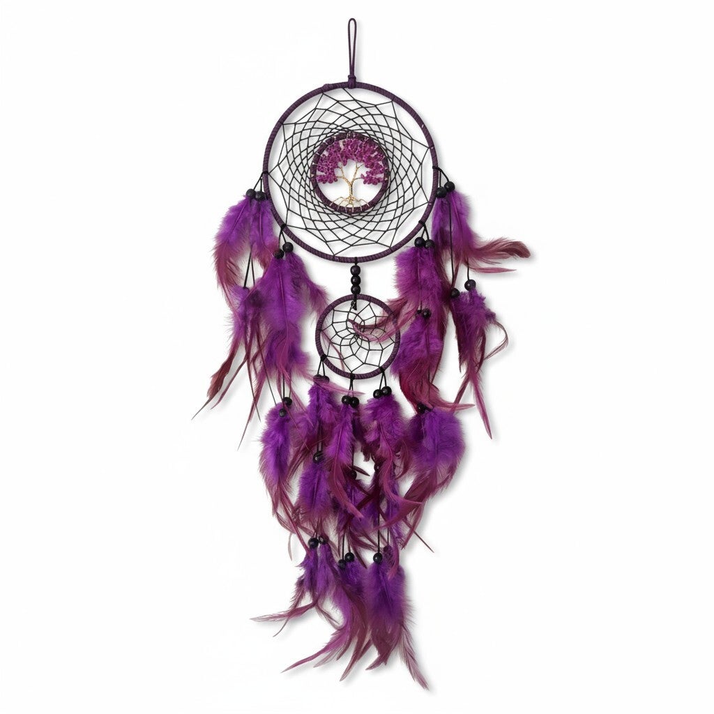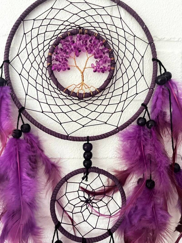 Flot lilla drømmefanger med to ringe og livets træ i halvædelstene i midten.