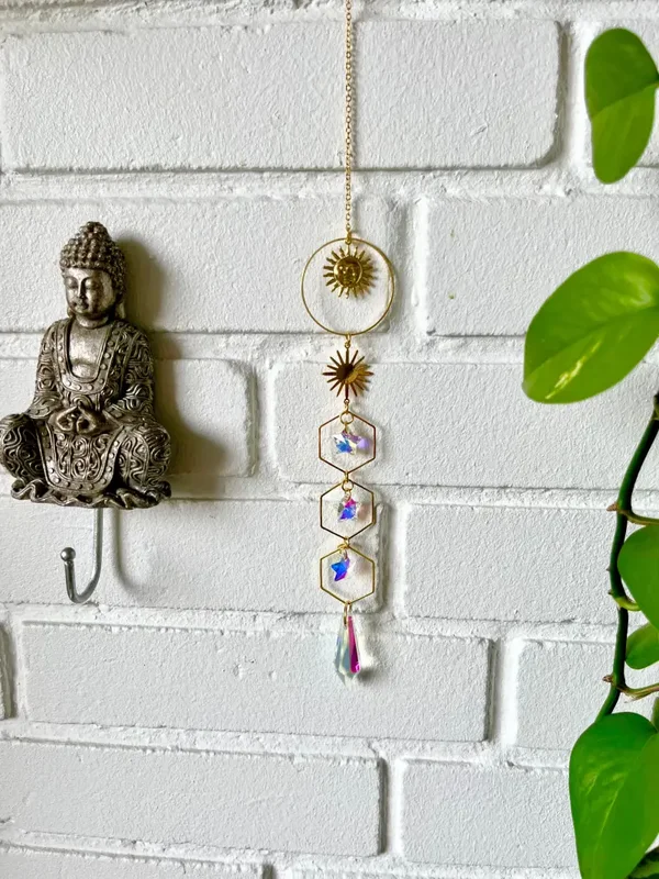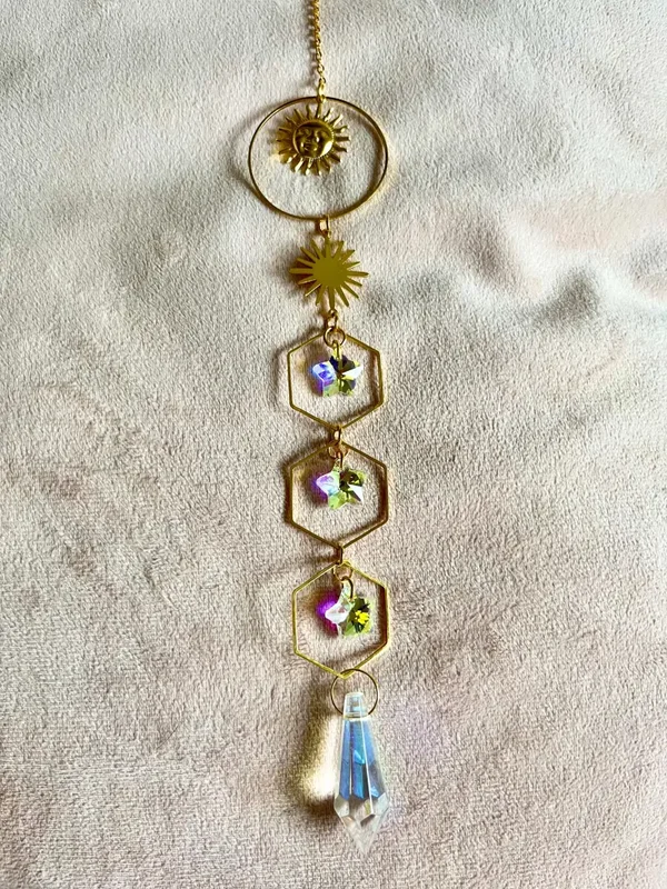 Ophæng/suncatcher i guldfarvet metal med krystaller/prismer.