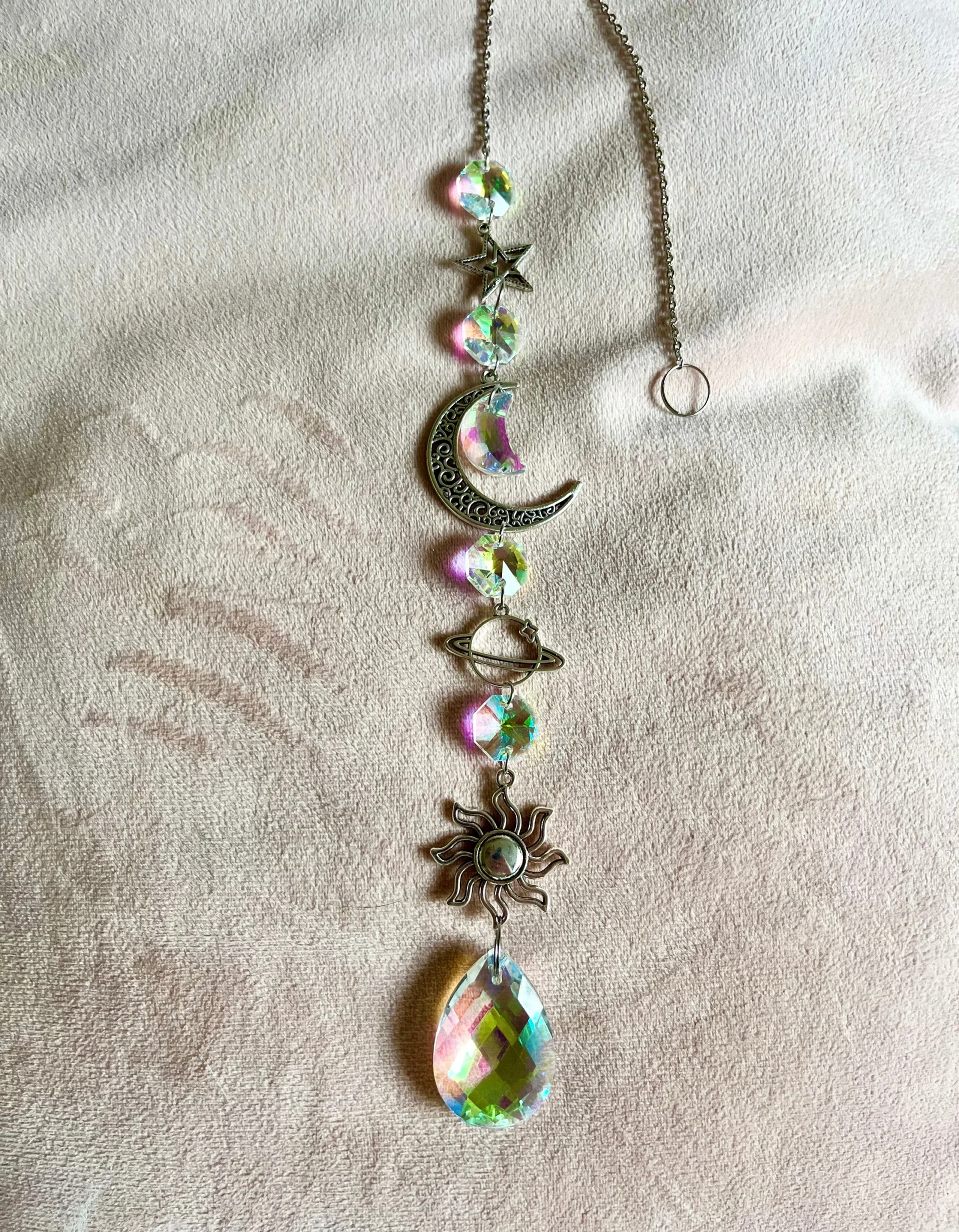 Ophæng/suncatcher i sølvfarvet metal med krystaller/prismer.
