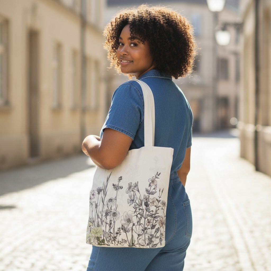Hvid totebag med blomster/planter i blå/grønne svage nuancer.