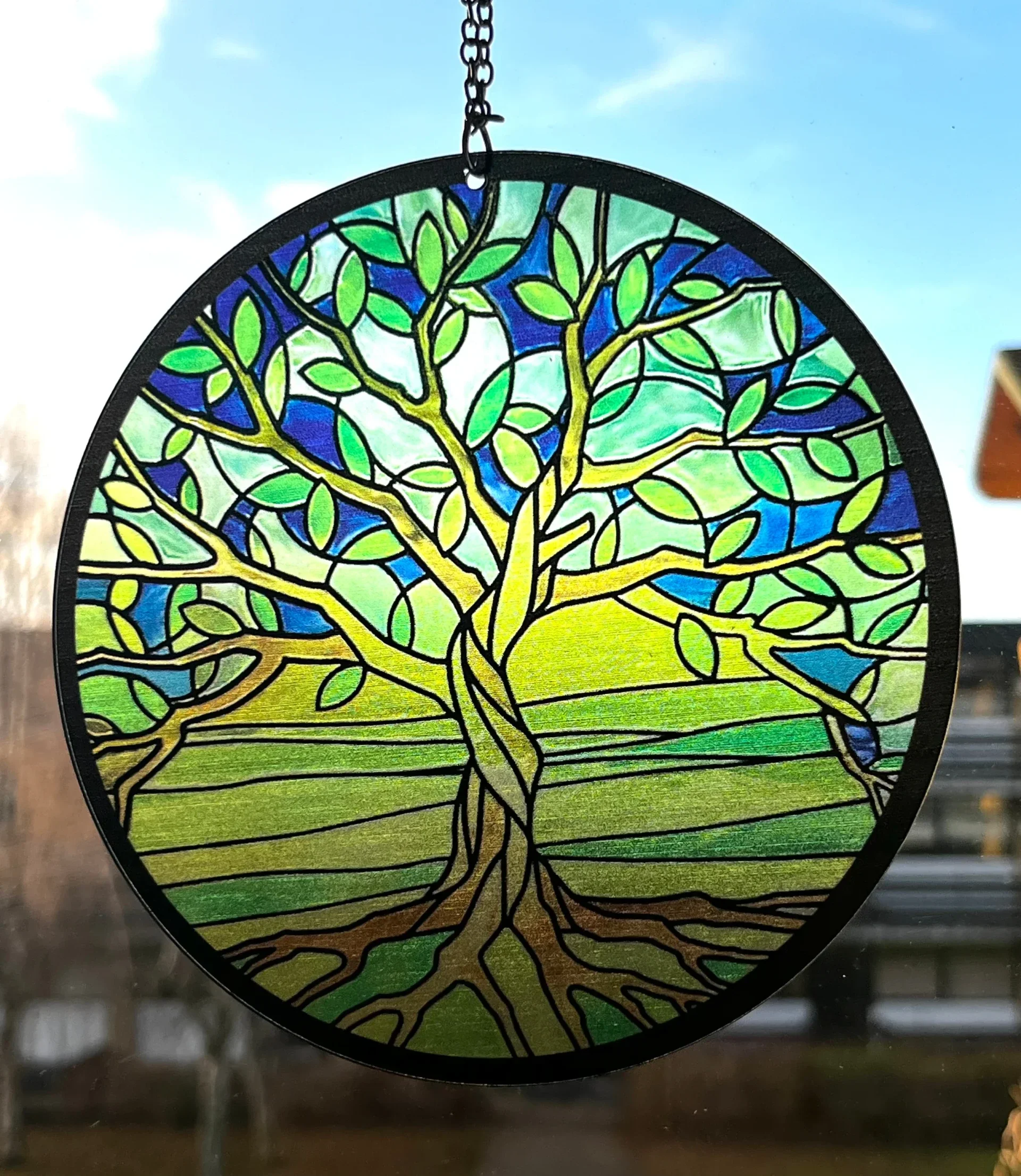 Vinduesophæng med livets træLavet i hård plast med gennemsigtig effekt så lyset skinner igennem.Hænger i metal kæde