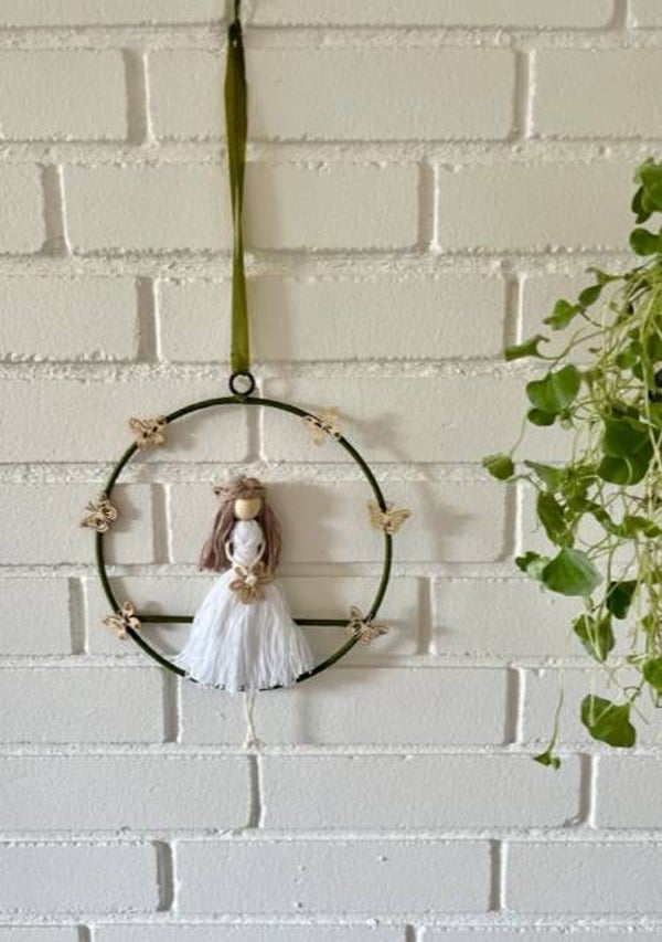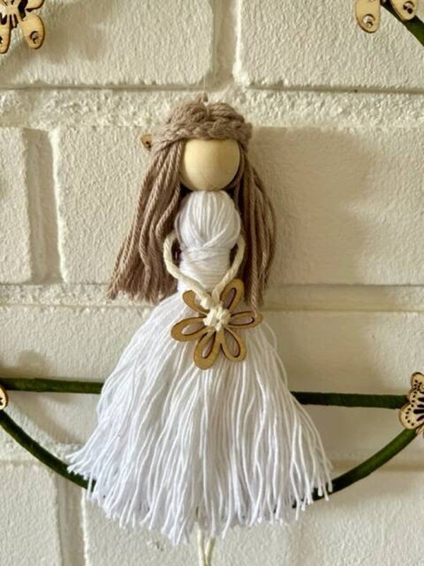Sød ballet pige med hvid kjole siddende i ring med træsommerfugle.