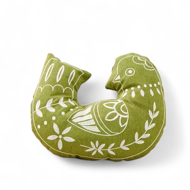 Flot pudebetræk formet som fugl i kraftig grønt stof med broderet hvide tegninger.