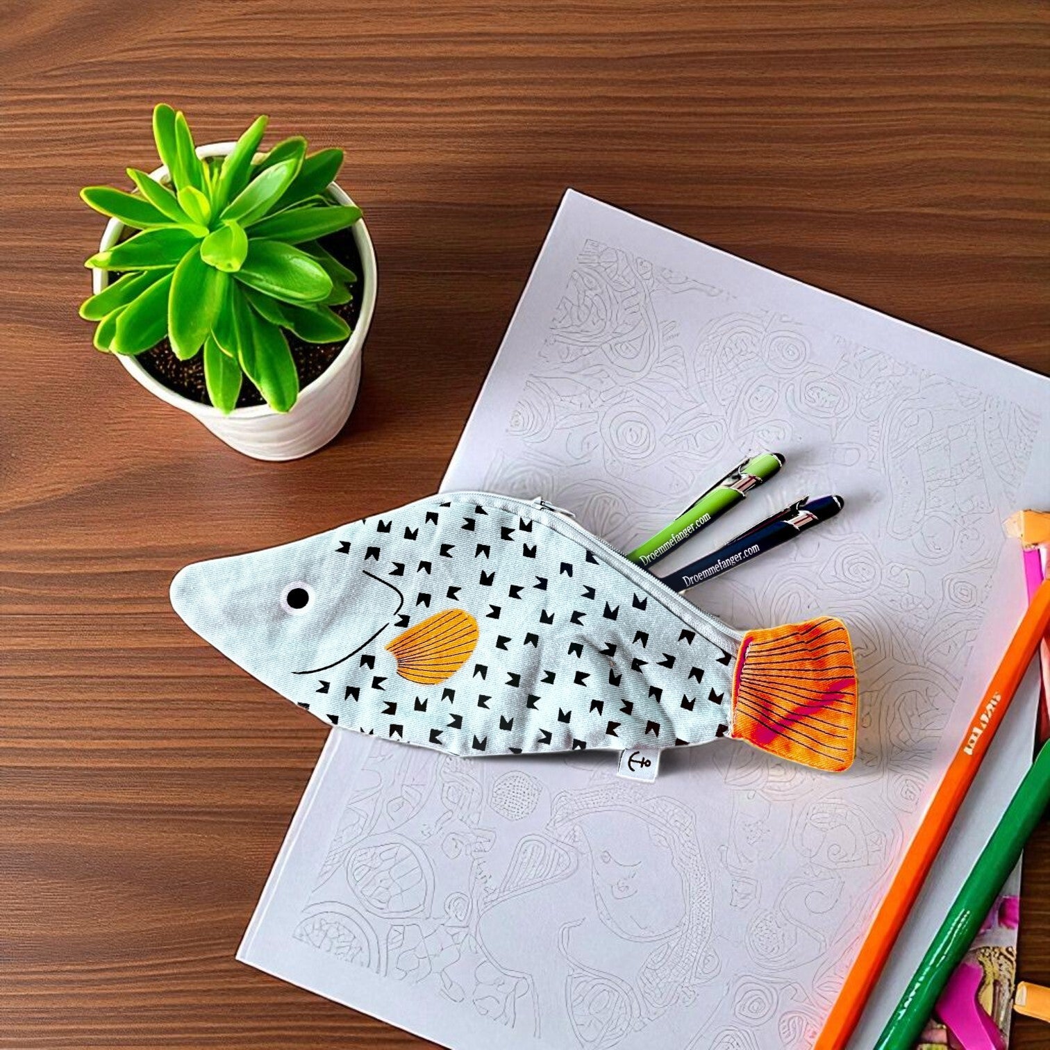 Sjovt penalhus i form af en fisk.