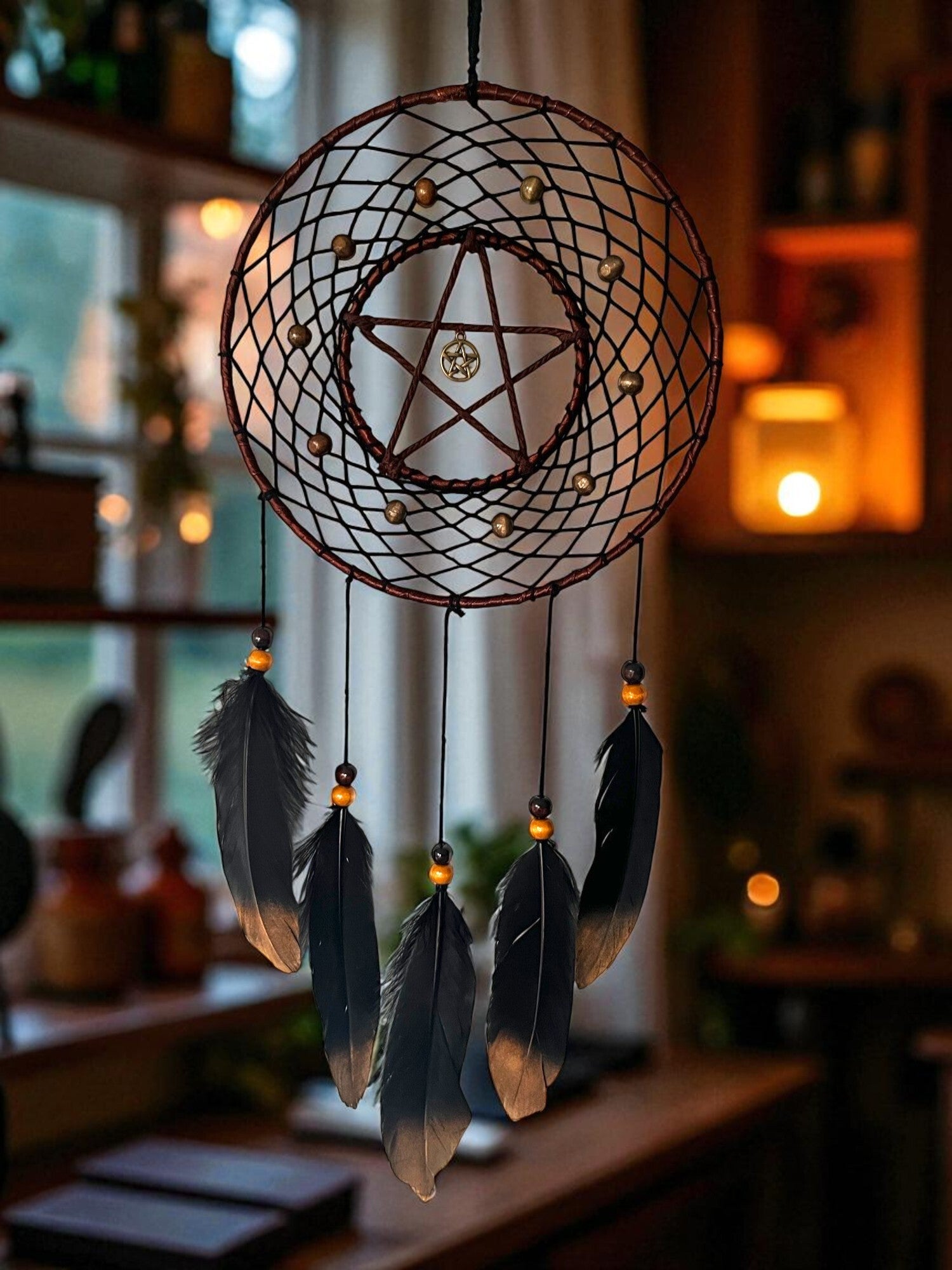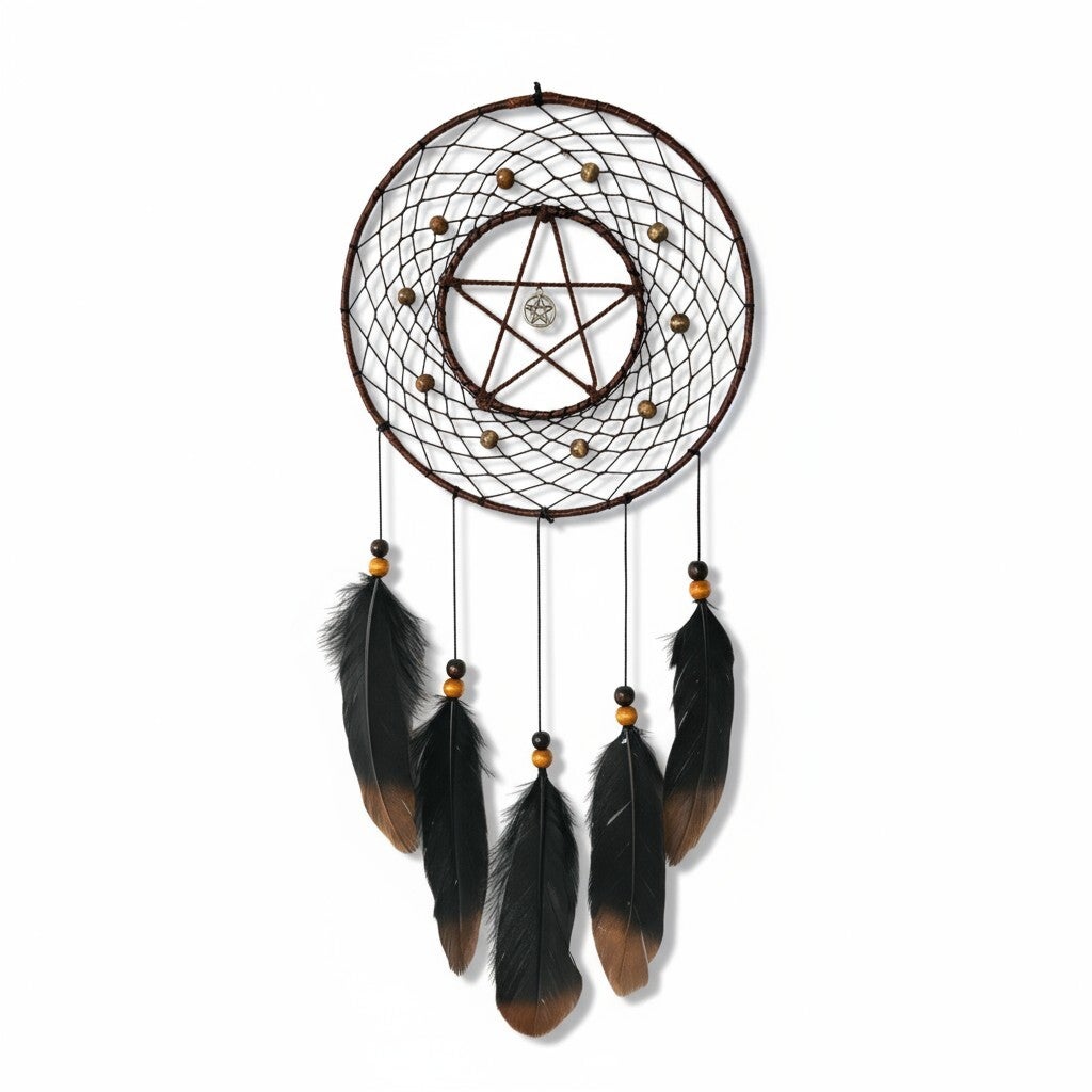 Denne unikke drømmefanger forener traditionel håndværkskunst med spirituel symbolik. Midt i nettet finder du et smukt pentagram – et stærkt wicca-symbol for balance, beskyttelse og de fem elementer: jord, vand, ild, luft og ånd.