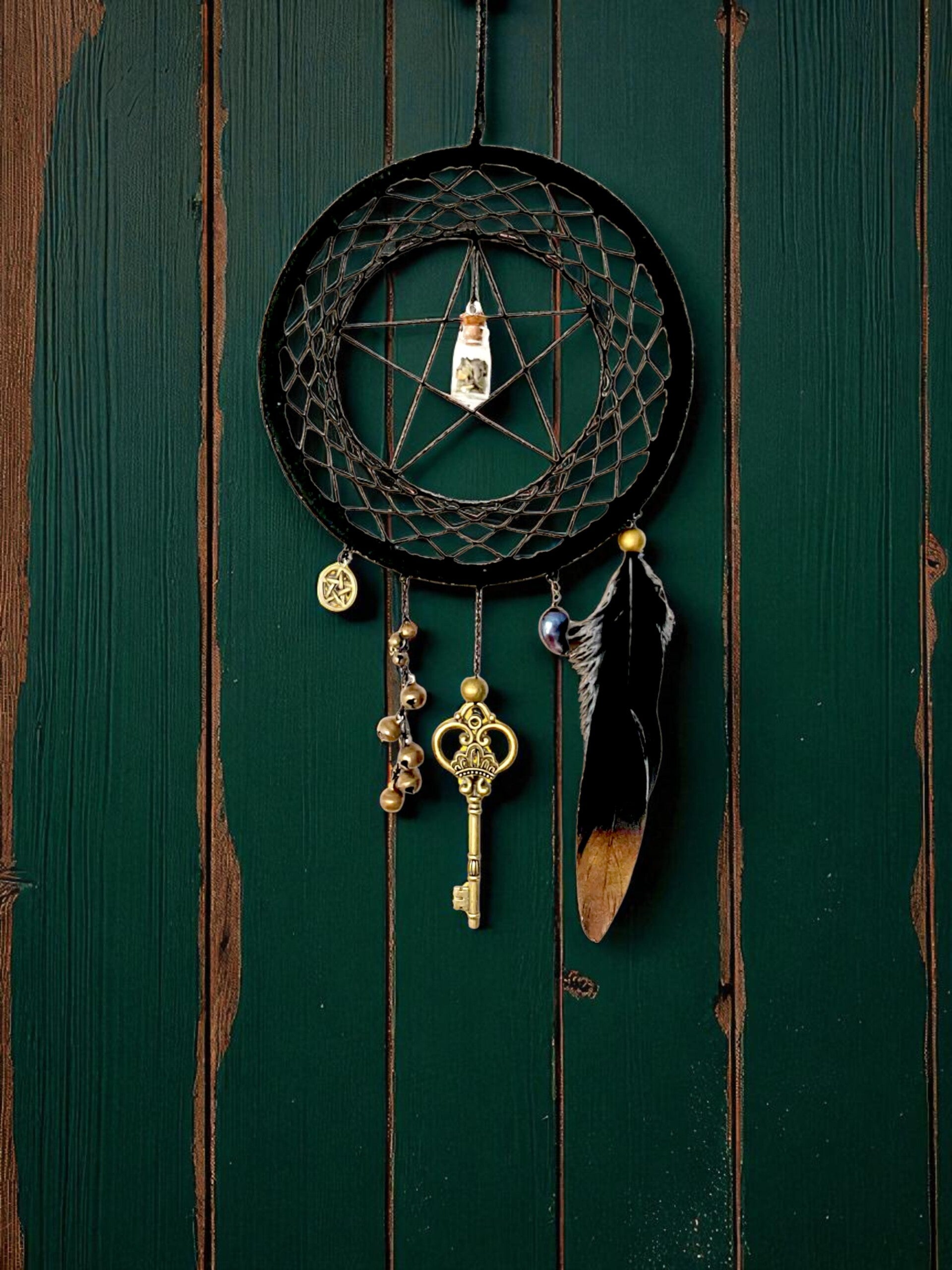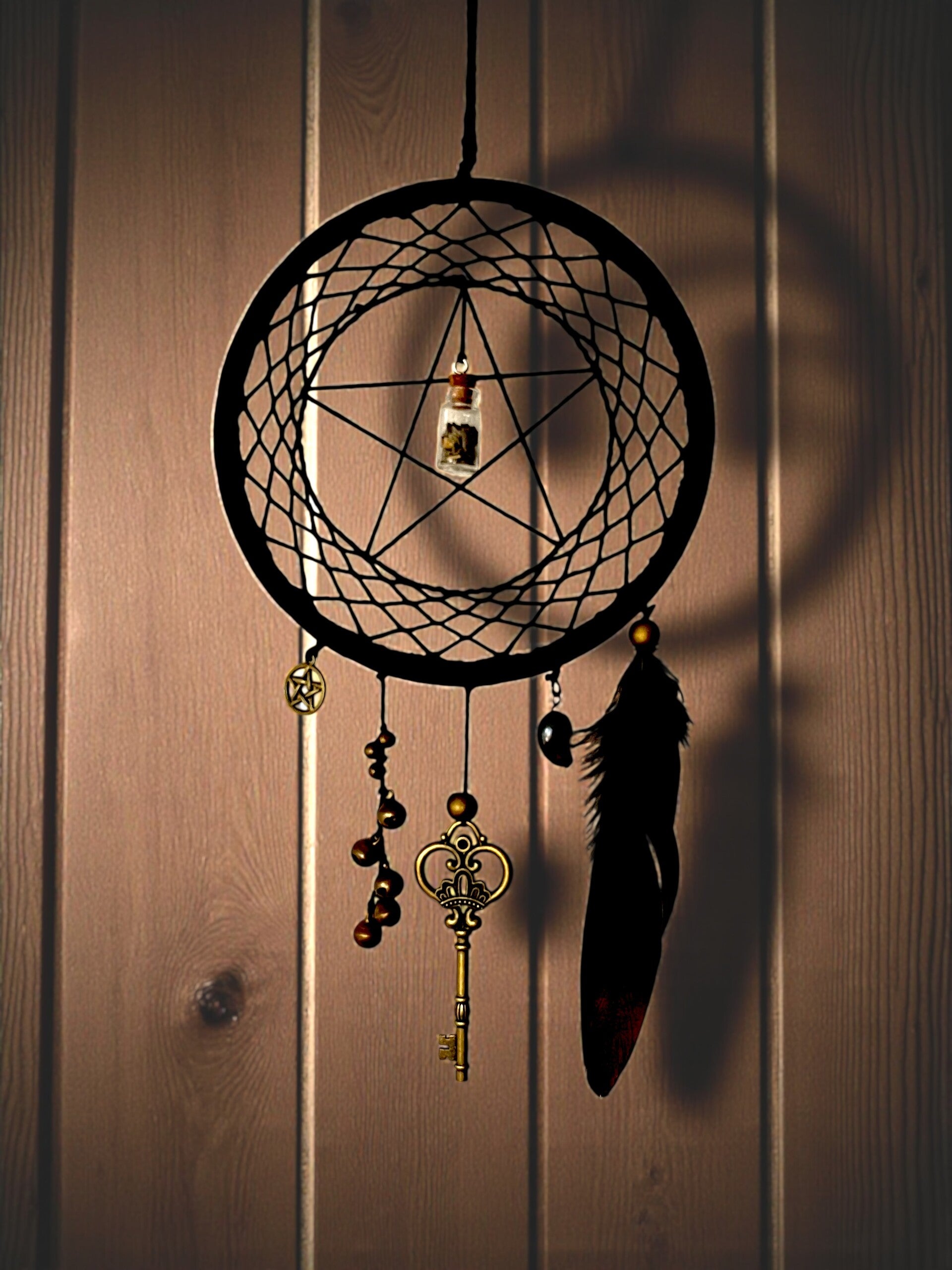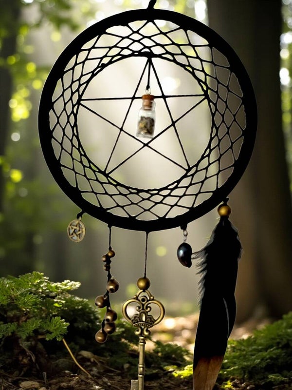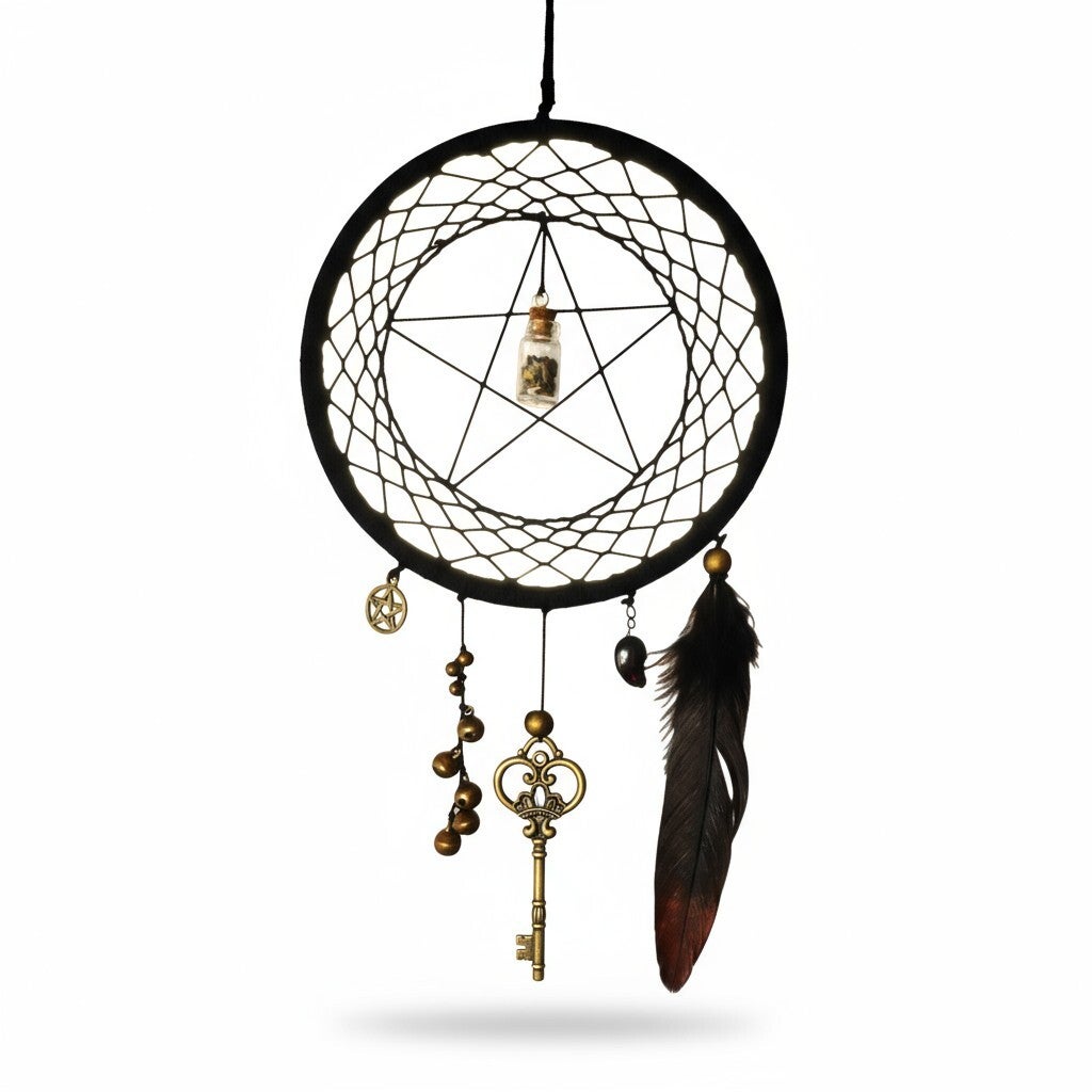 Denne drømmefanger er mere end blot smuk vægpynt – den er et lille stykke magi til dit hjem. I midten ses et kraftfuldt pentagram, symbolet på beskyttelse og balance. Fra midten hænger et lille glas med tørrede salvie, kendt for deres helende og spirituelle energi.
