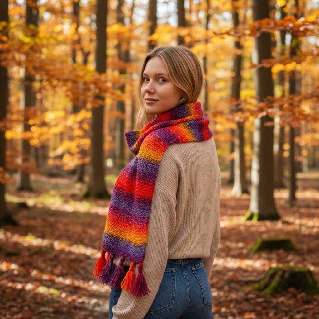 Indhyl dig i varme og farver med dette lækre, håndlavede halstørklæde i eget design.