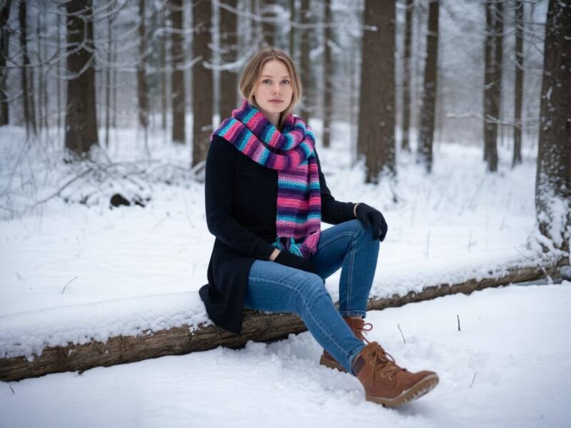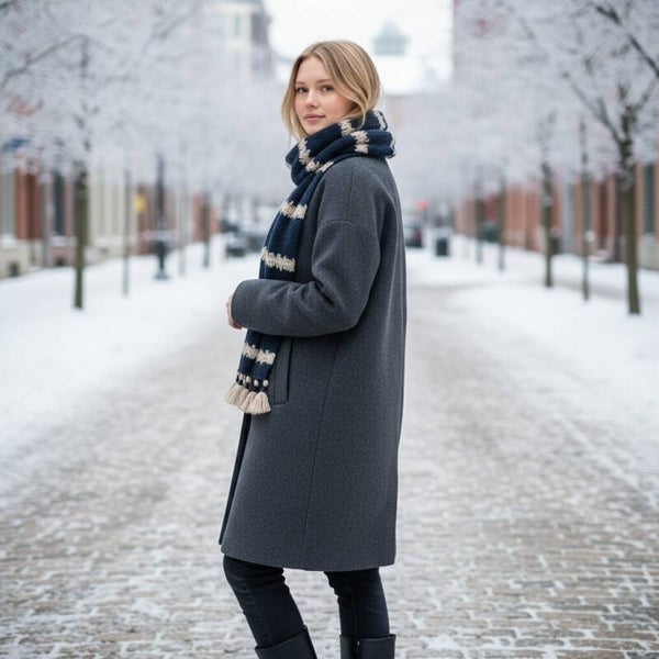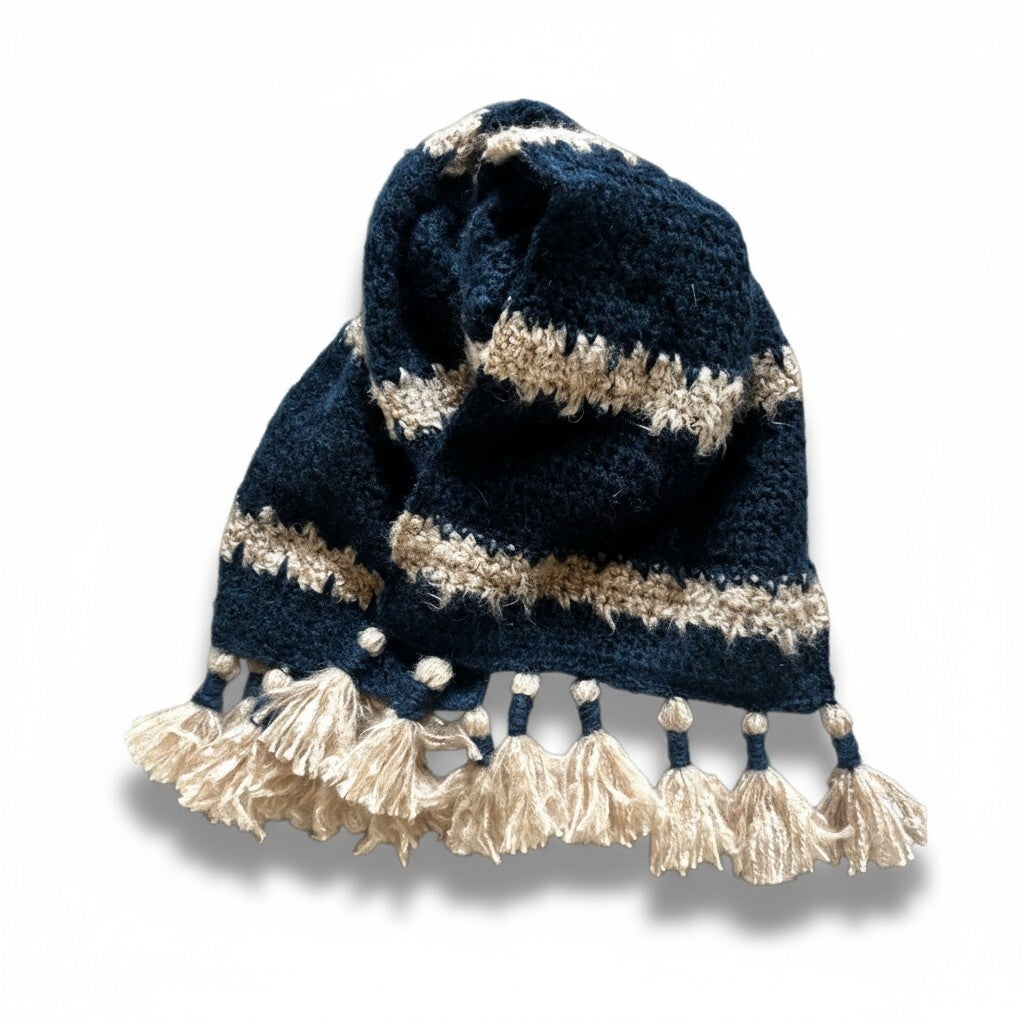 Håndhæklet halstørklæde i smukke, rolige nuancer af petrolblå og beige. Tørklædet er lavet med sans for detaljer og har et levende, tekstureret mønster, der giver et varmt og hyggeligt udtryk. De dekorative kvaster i enderne tilfører et legende og boho-inspireret præg, som gør det nemt at style til både jakke og frakke.