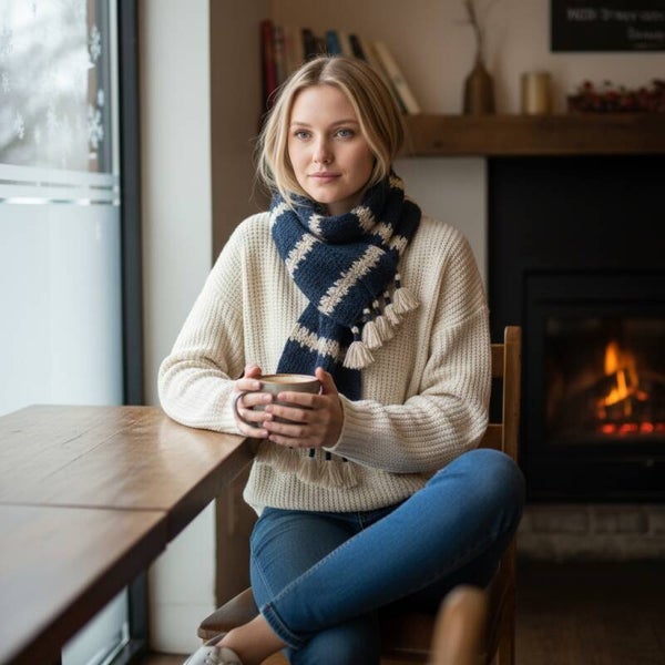 Hæklet tykt halstørklæde i mørk petrol blå og beige