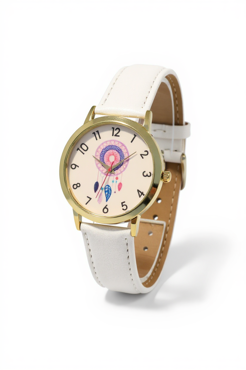 Elegant smykkeur med hvid rem i vegansk læder og en fin urskive dekoreret med en drømmefanger i sarte farver. Uret forener boho-charme med enkel elegance – et feminint valg, der passer perfekt til både hverdag og særlige øjeblikke.