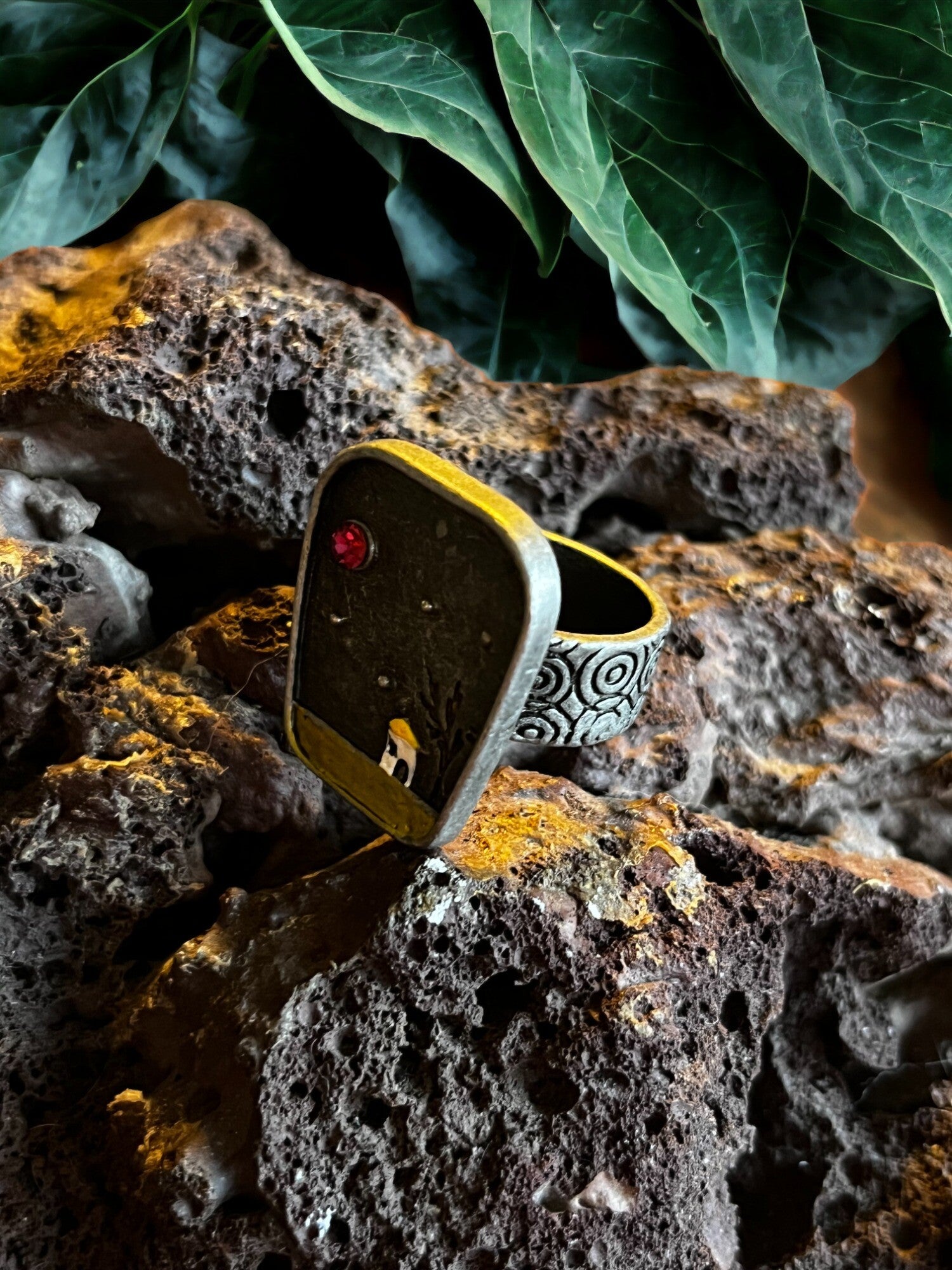Vildt flot rustik ring i oxyderet metal med motiv af hus med måne og stjerne. Her får du en helt unik ring.