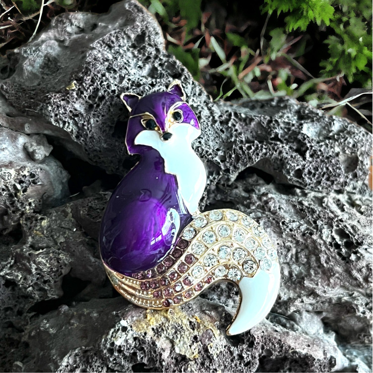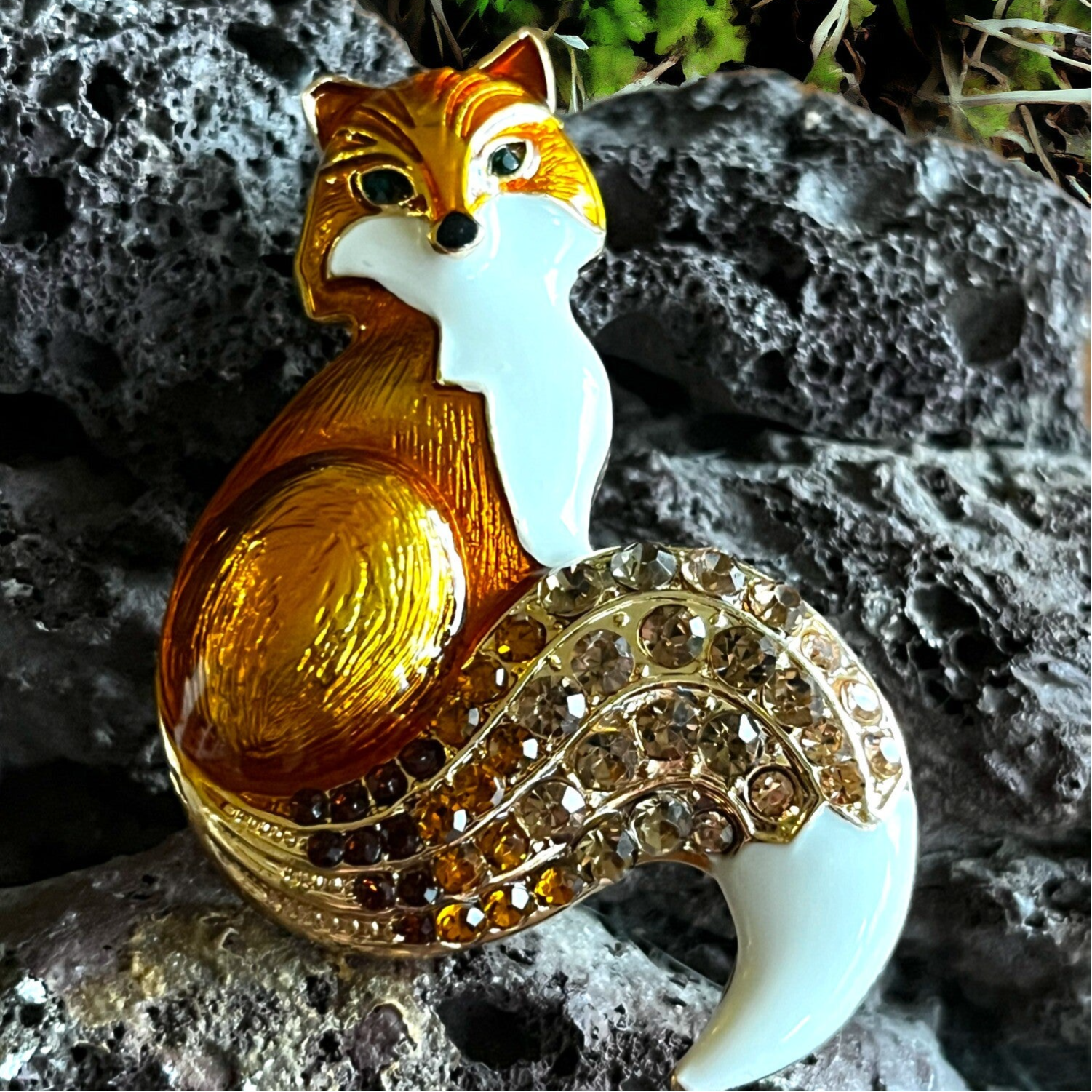 Smuk broche med ræv i emalje og similisten