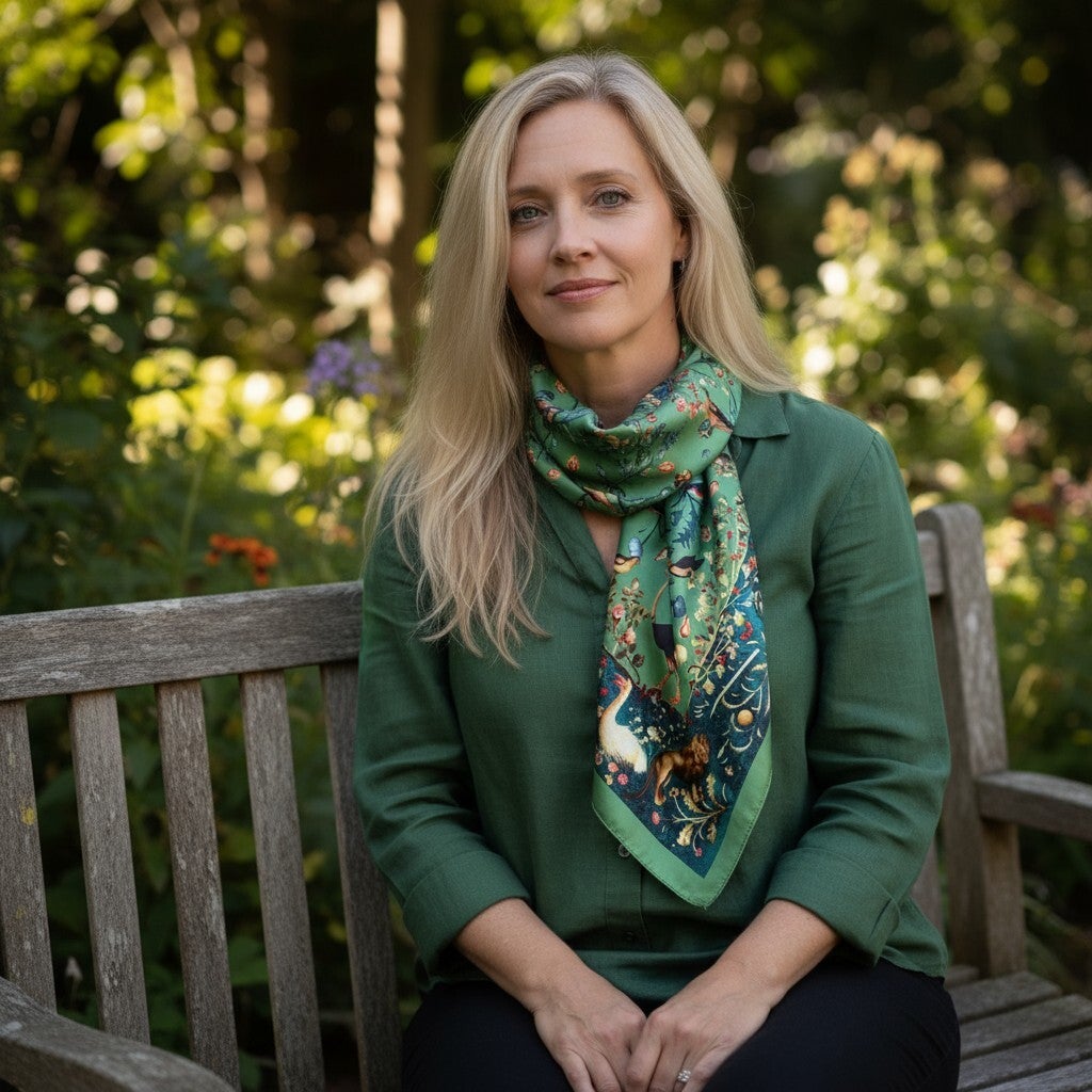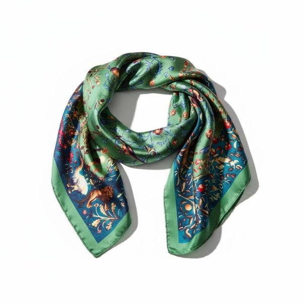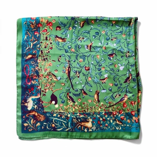 Smukt og blødt tørklæde i stærke grønne nuancer med dyr i renæssance udtryk.