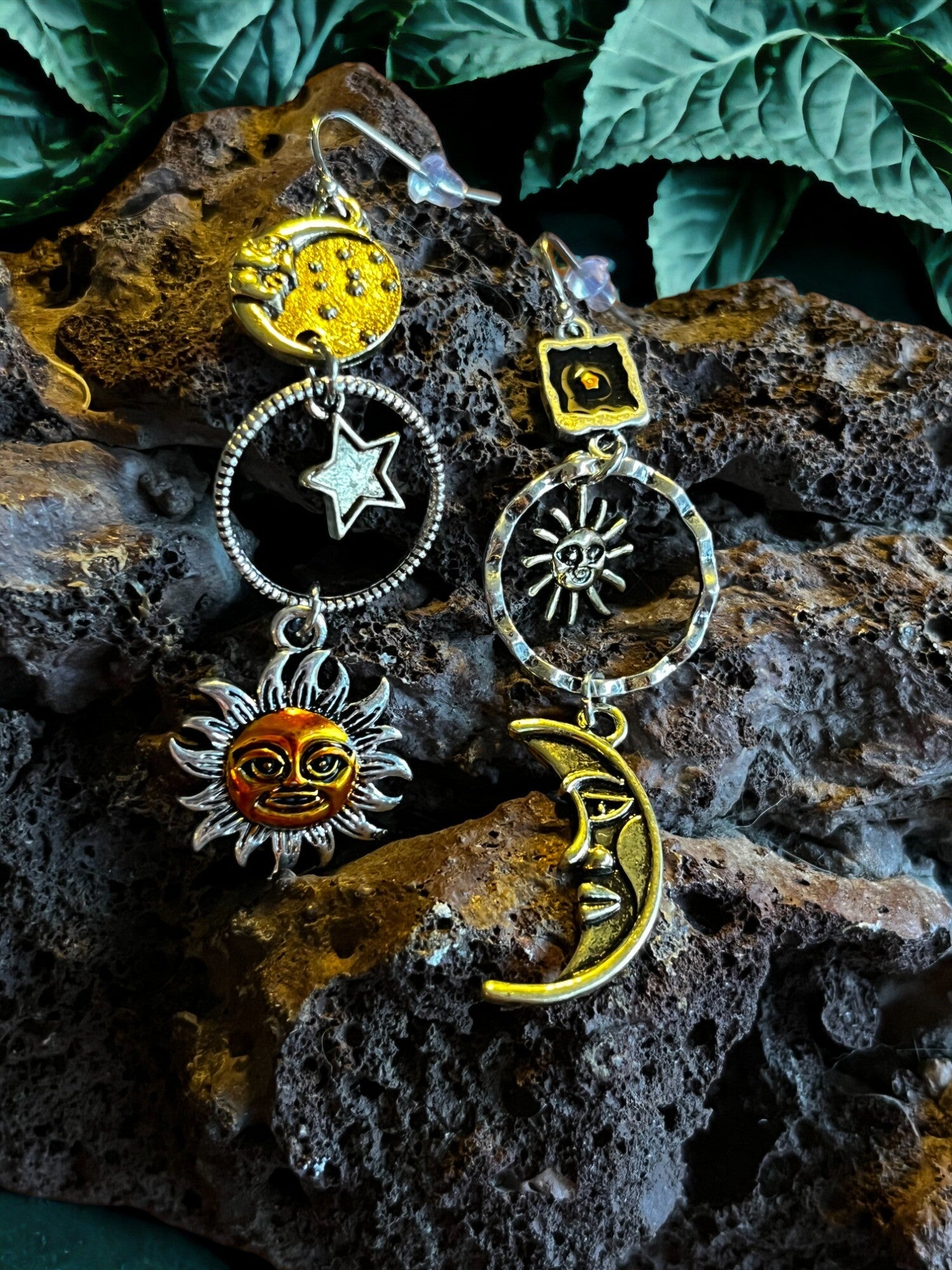 Flotte rustikke lange ørehængere med måle, stjerne og solmotiv