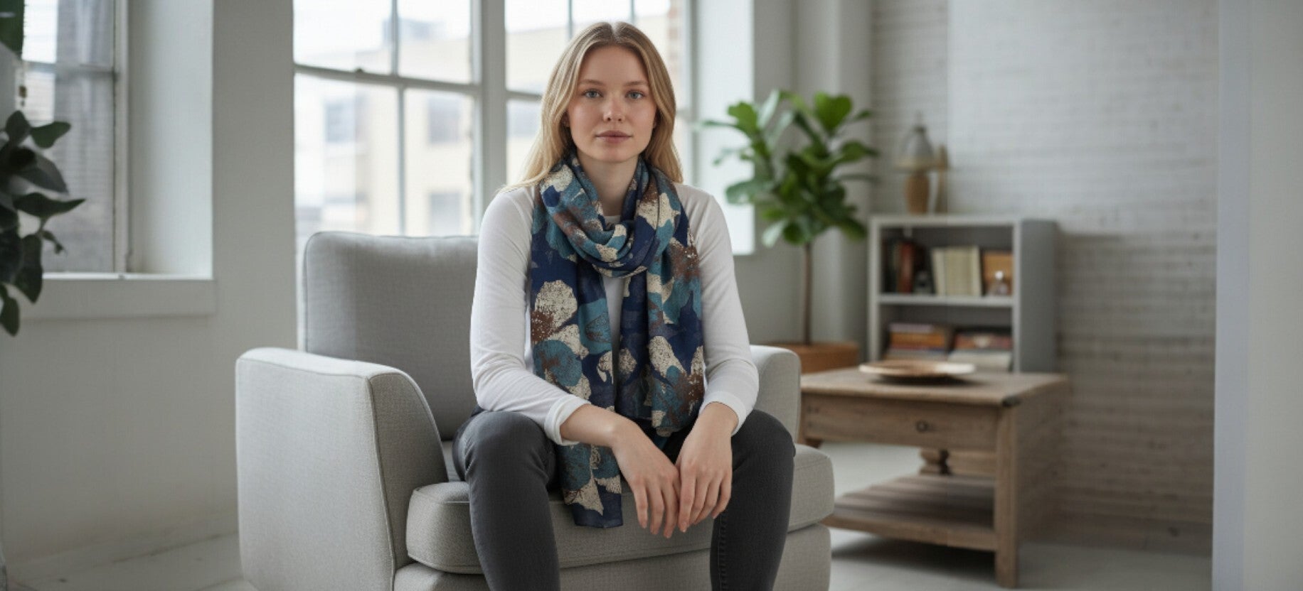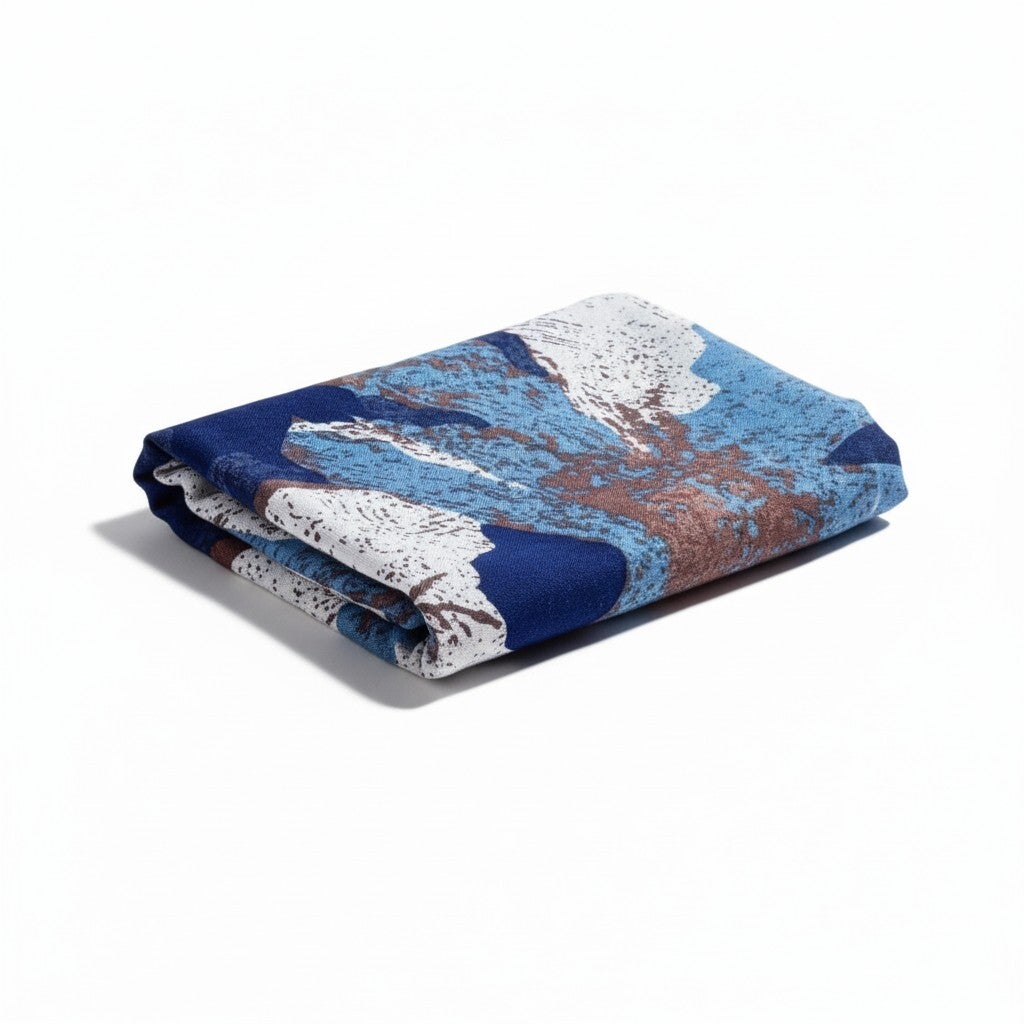 Dette tørklæde er vævet i blød polyester og prydet med et flot, naturinspireret print i dybe blå, jordfarver og lyse nuancer. Mønstret giver et roligt, kunstnerisk udtryk, der gør tørklædet let at style både til afslappede hverdagslooks og mere klassiske outfits. Stoffet falder smukt og let omkring hals og skuldre, og farverne holder sig klare sæson efter sæson. Et alsidigt accessorie, der tilfører varme og personlighed på en diskret og stilfuld måde.