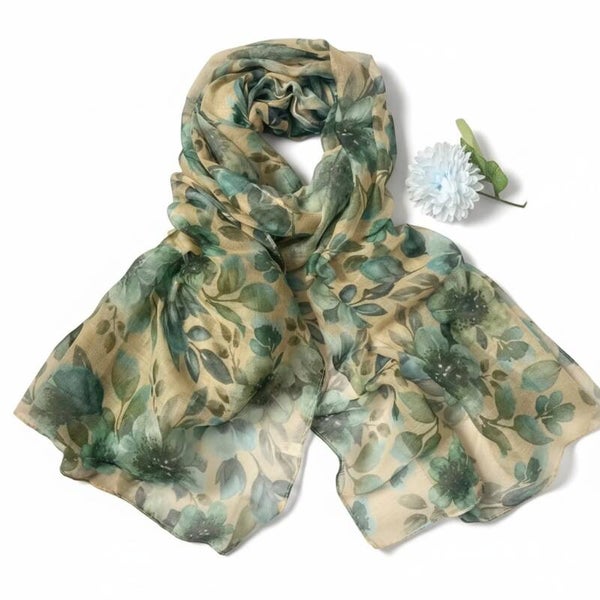 Dette tørklæde er vævet i blød polyester og dekoreret med et elegant blomsterprint i dæmpede grønne og beige nuancer. Det giver et let og harmonisk udtryk, som passer perfekt til både lyse og neutrale outfits. Stoffet falder smidigt og behageligt, og det brede mønster gør det nemt at style på mange måder. Et tidløst accessorie, der tilfører et roligt strejf af natur og underspillet charme.