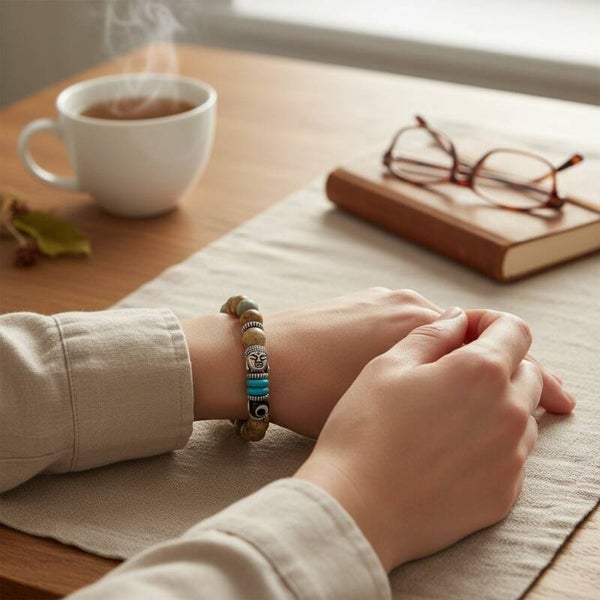 Armbånd med glasperler og buddha - elastik så passer alle.