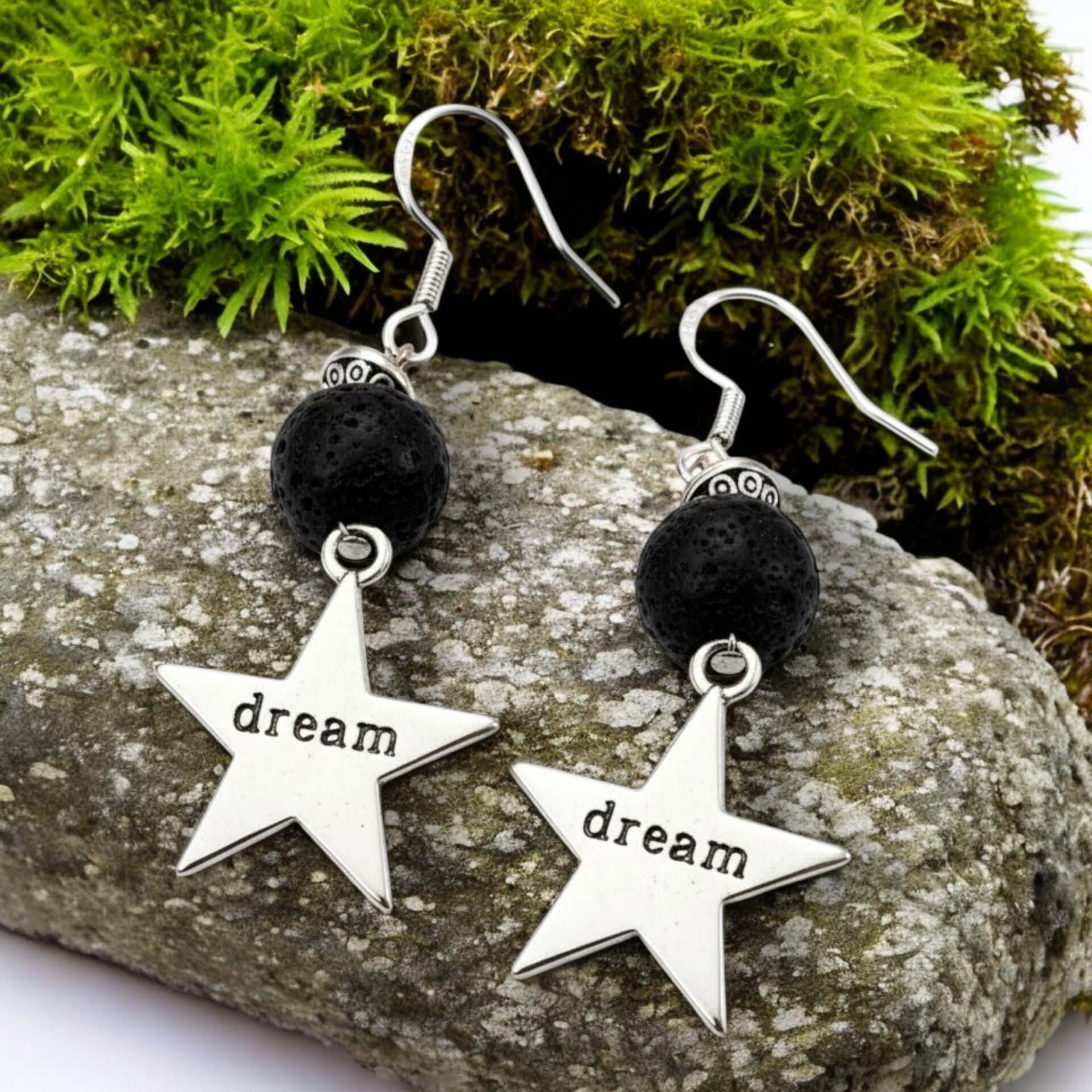 Disse drømmende øreringe kombinerer rå, sorte lavasten med en elegant stjernevedhæng præget med ordet dream. Resultatet er et stilfuldt og symbolsk smykke, der både udstråler styrke og håb. Perfekte til dig, der elsker et personligt udtryk – og som gerne vil bære en lille påmindelse om at følge dine drømme.