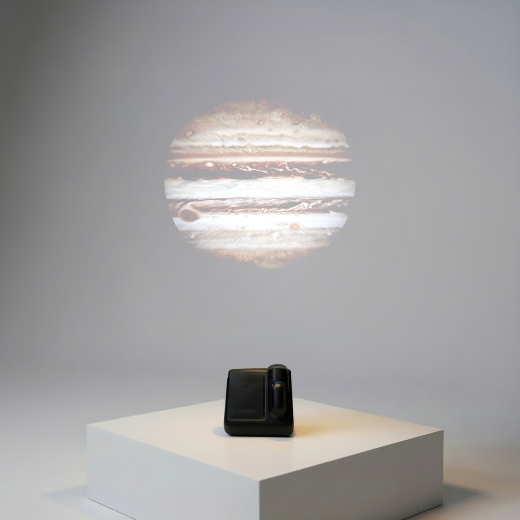 Lille planetprojektor med 16 forskellige slides med forskellige planeter. Stil den på et bord og lad den lyse væggen eller loftet op. Jo længere væk den står, desto større billede.