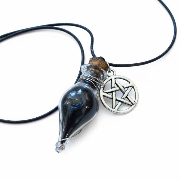 Lille flaske med sort pulver og Pentakel i læder-look snor, der kan indstilles i omkreds.