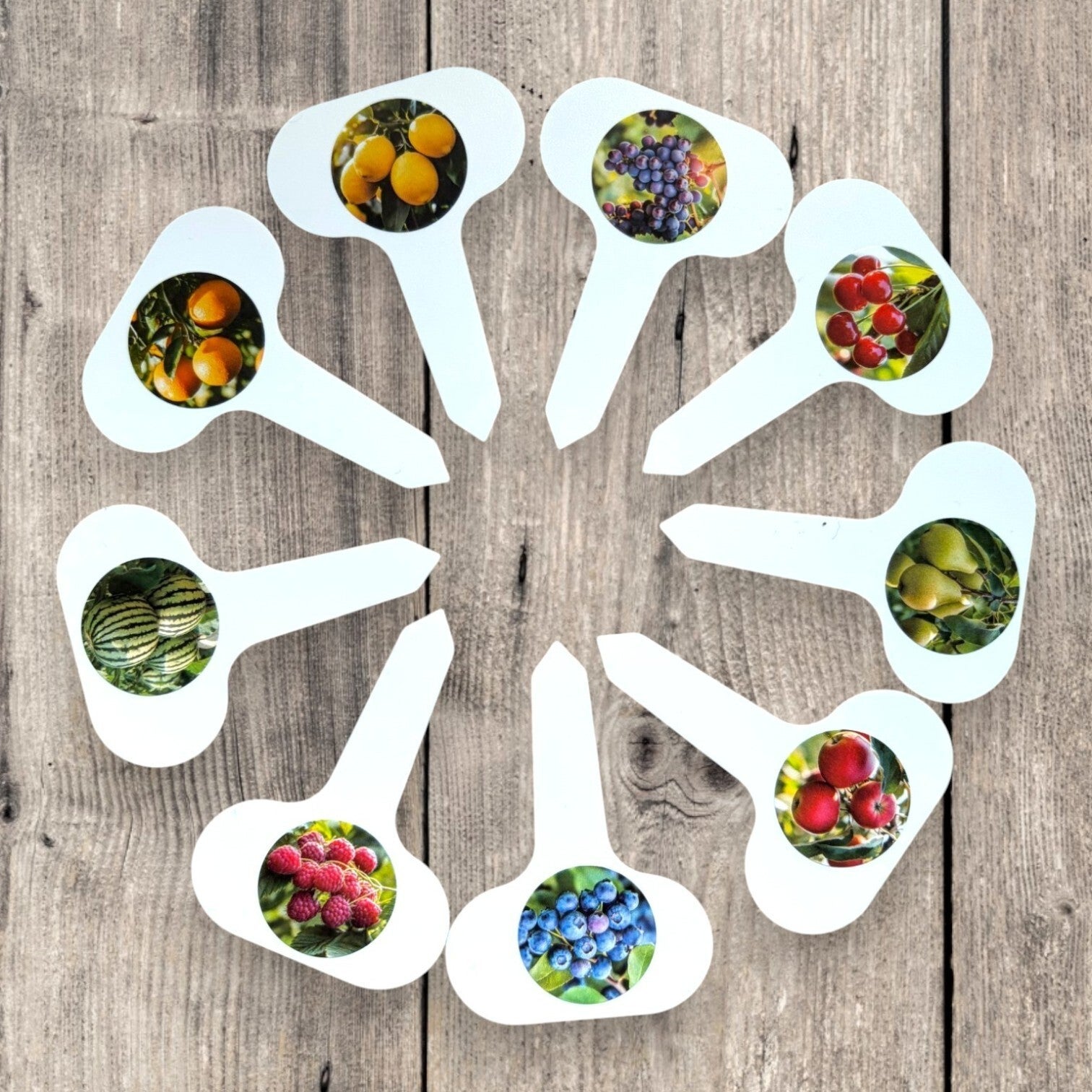9 stk plantetags i plastik med motiv af forskellige frugter.